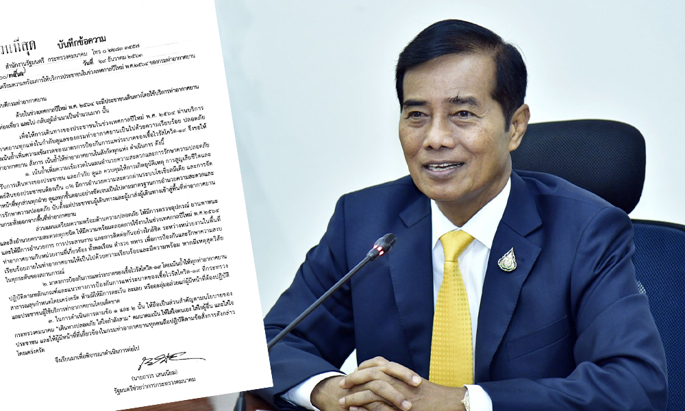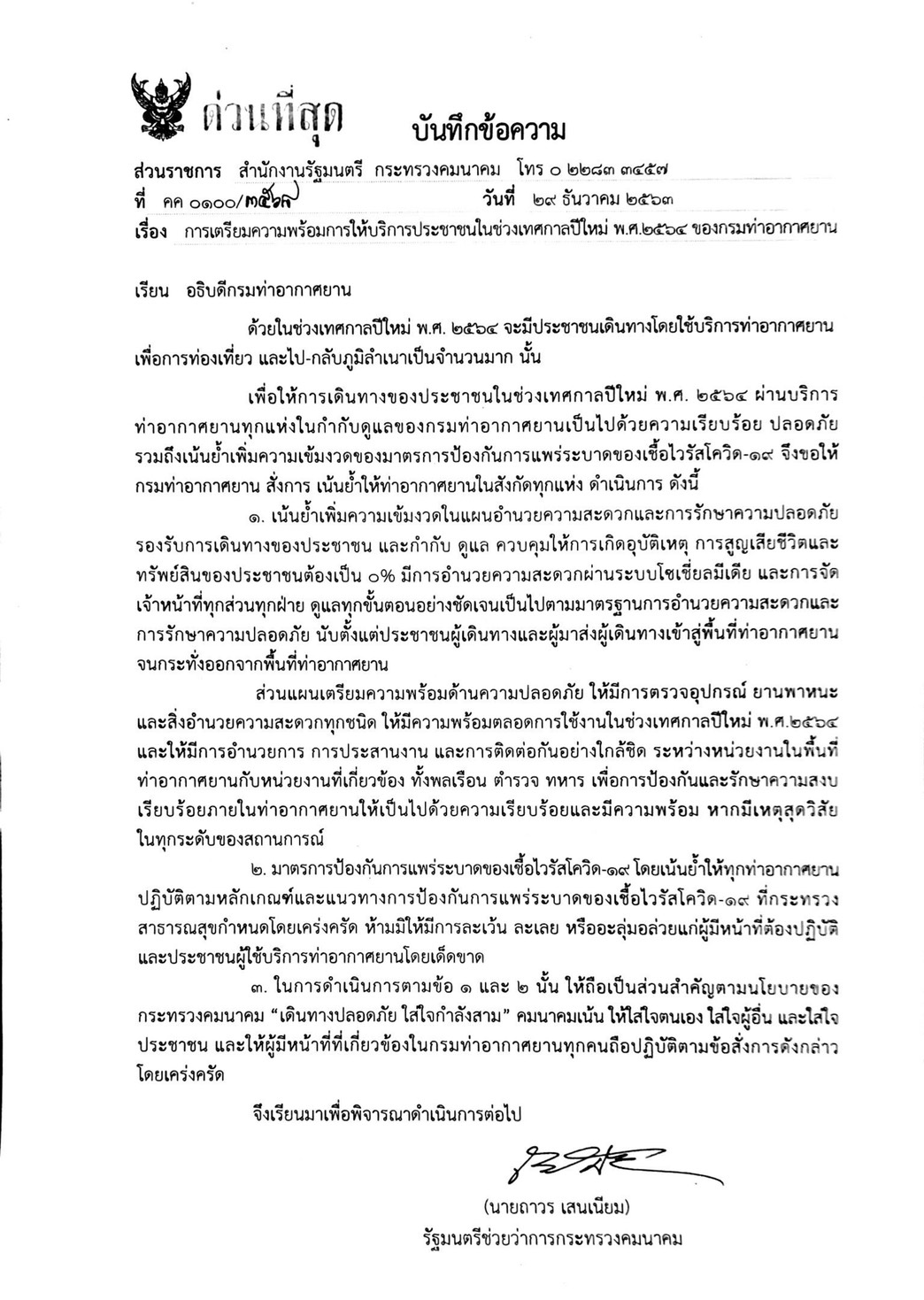 เมื่อวันที่ 29 ธ.ค. นายถาวร เสนเนียม รมช.คมนาคม ลงนามหนังสือสั่งการ ด่วนที่สุด ที่ คค 0111/3568 ถึงอธิบดีกรมท่าอากาศยาน เรื่อง การเตรียมความพร้อมการให้บริการประชาชนในช่วงเทศกาลปีใหม่ พ.ศ. 2564 ของกรมท่าอากาศยาน (ทย.) โดยสั่งการให้ท่าอากาศยานทุกแห่งในกำกับดูแลของกรมท่าอากาศยาน (ทย.) เพิ่มความเข้มงวดของมาตรการป้องกันการแพร่ระบาดของเชื้อไวรัสโควิด-19 ในช่วงเทศกาลปีใหม่ พ.ศ.2564 ได้แก่