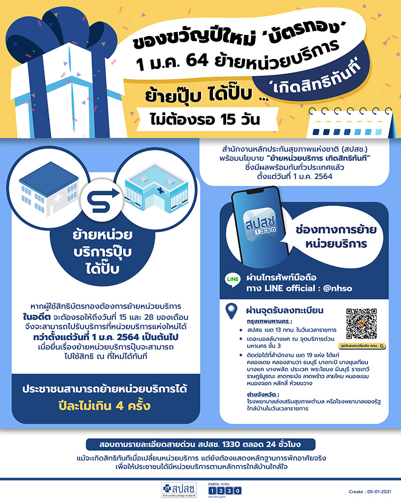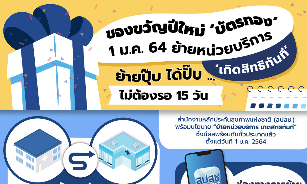 สำนักข่าวอิศรา (www.isranews.org) รายงานว่า นพ.ศักดิ์ชัย กาญจนวัฒนา เลขาธิการสำนักงานหลักประกันสุขภาพแห่งชาติ (สปสช.) เปิดเผยแนวทางการดำเนินงานตามนโยบายของนายอนุทิน ชาญวีรกูล รองนายกรัฐมนตรีและรัฐมนตรีว่าการกระทรวงสาธารณสุข (สธ.) ในการ “ย้ายหน่วยบริการ เกิดสิทธิทันที ไม่ต้องรอ 15 วัน” ได้เริ่มพร้อมกันทั่วประเทศแล้วตั้งแต่วันที่ 1 มกราคม 2564 โดยเป็น 1 ใน 4 ของการพัฒนาระบบบริการในระบบหลักประกันสุขภาพแห่งชาติ (บัตรทอง) ที่จะช่วยลดขั้นตอน และแก้ไขปัญหาต่างๆ ที่เป็นอุปสรรคต่อการเข้ารับบริการให้กับประชาชน