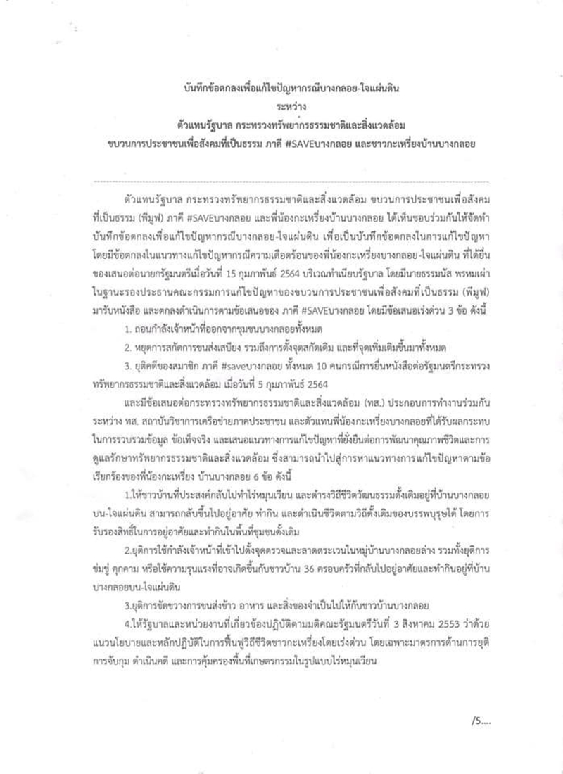 ม็อบ 'กะเหรี่ยงบางกลอย' เตรียมกลับภูมิลำเนาวันที่ 17 ก.พ.หลัง 'วราวุธ' และ 'ร.อ.ธรรมนัส' ยอมลงนามในหนังสือข้อตกลง ยุติการขัดขวางชาวบ้านบางกลอยกลับใจหมู่บ้าน