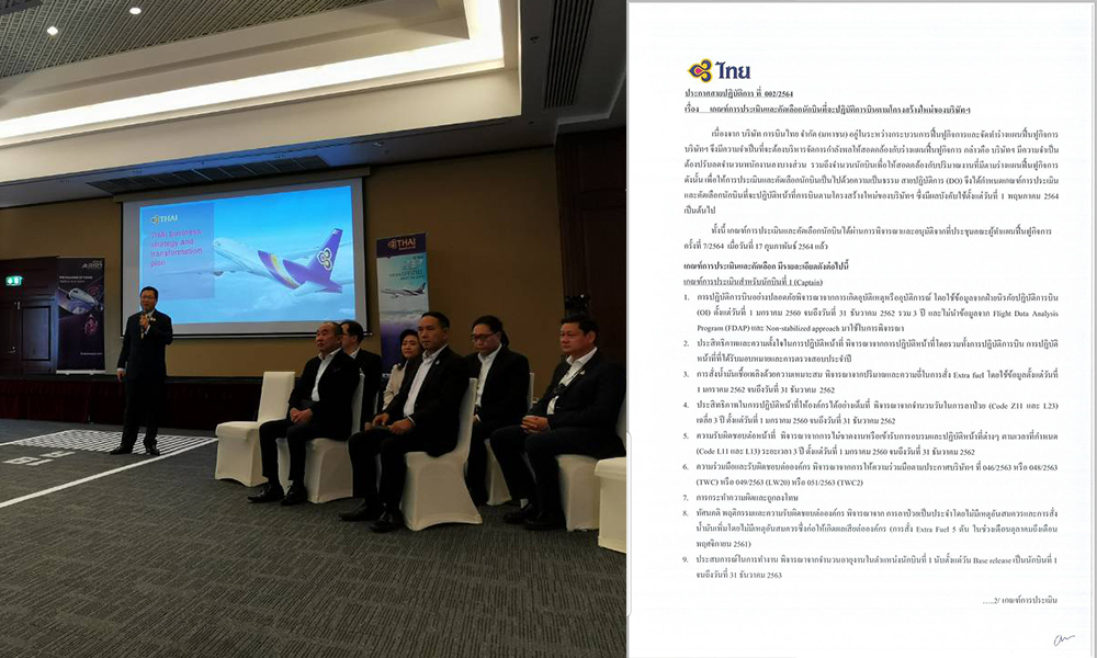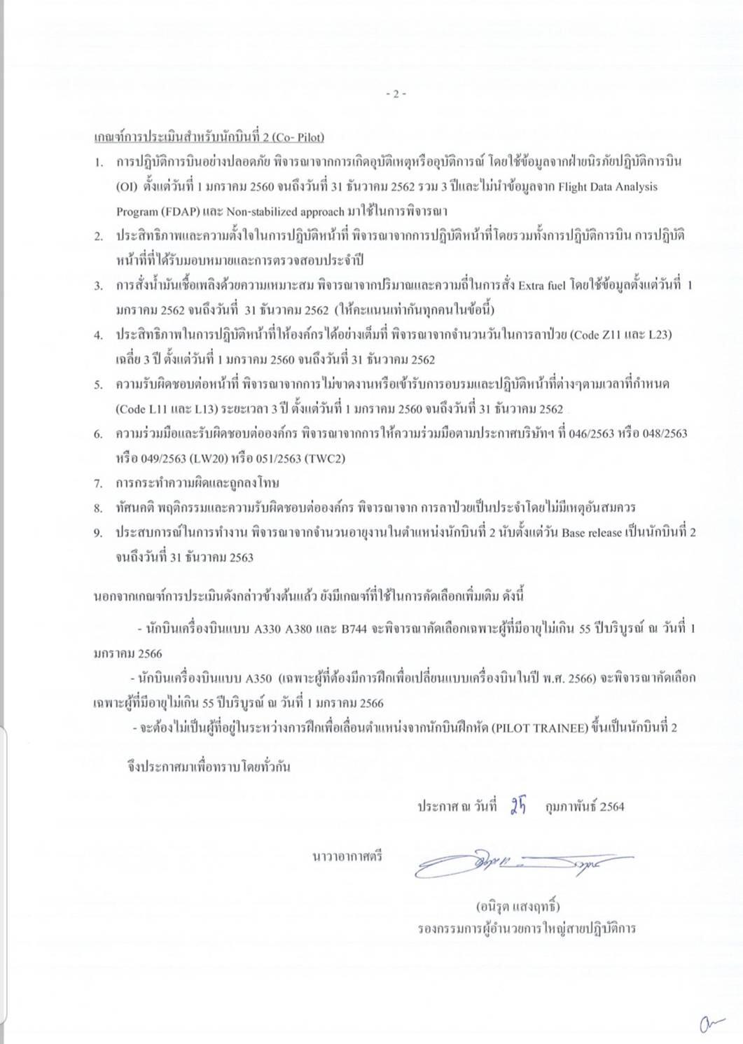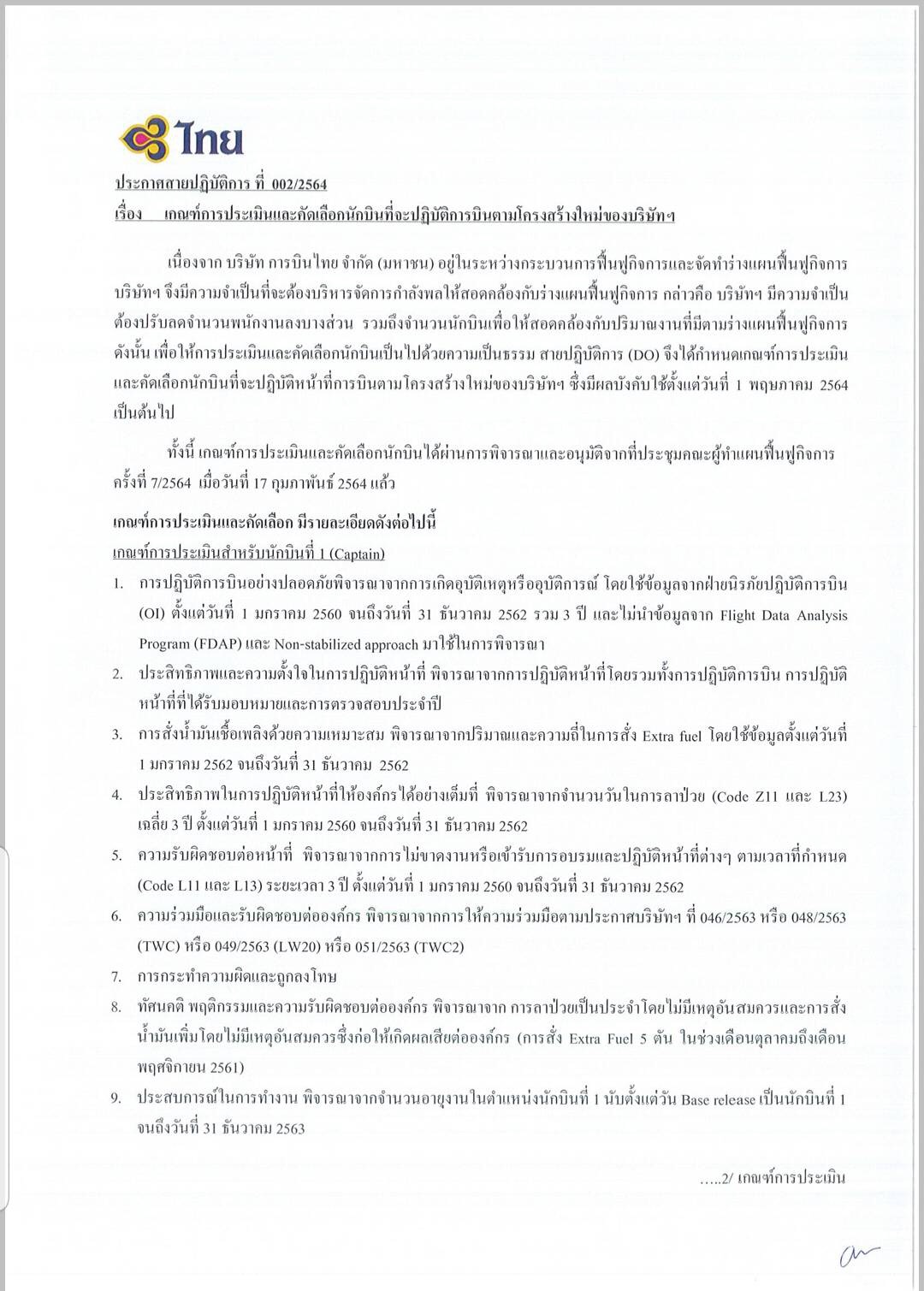สำนักข่าวอิศรา (www.isranews.org) รายงานว่า เมื่อวันที่ 25 ก.พ.ที่ผ่านมา น.ต.อนิรุต แสงฤทธิ์ รองกรรมการผู้อำนวยการใหญ่สายปฏิบัติการ บริษัท การบินไทย จำกัด (มหาชน) ลงนามประกาศสายปฏิบัติการที่ 002/2564 เรื่อง เกณฑ์การประเมินและคัดเลือกนักบินที่จะปฏิบัติการบินตามโครงสร้างใหม่ของบริษัท ซึ่งเกณฑ์การประเมินดังกล่าวได้ผ่านการพิจารณาและอนุมัติจากที่ประชุมคณะผู้ทำแผนฟื้นฟูกิจการฯเมื่อวันที่ 17 ก.พ.2564 แล้ว