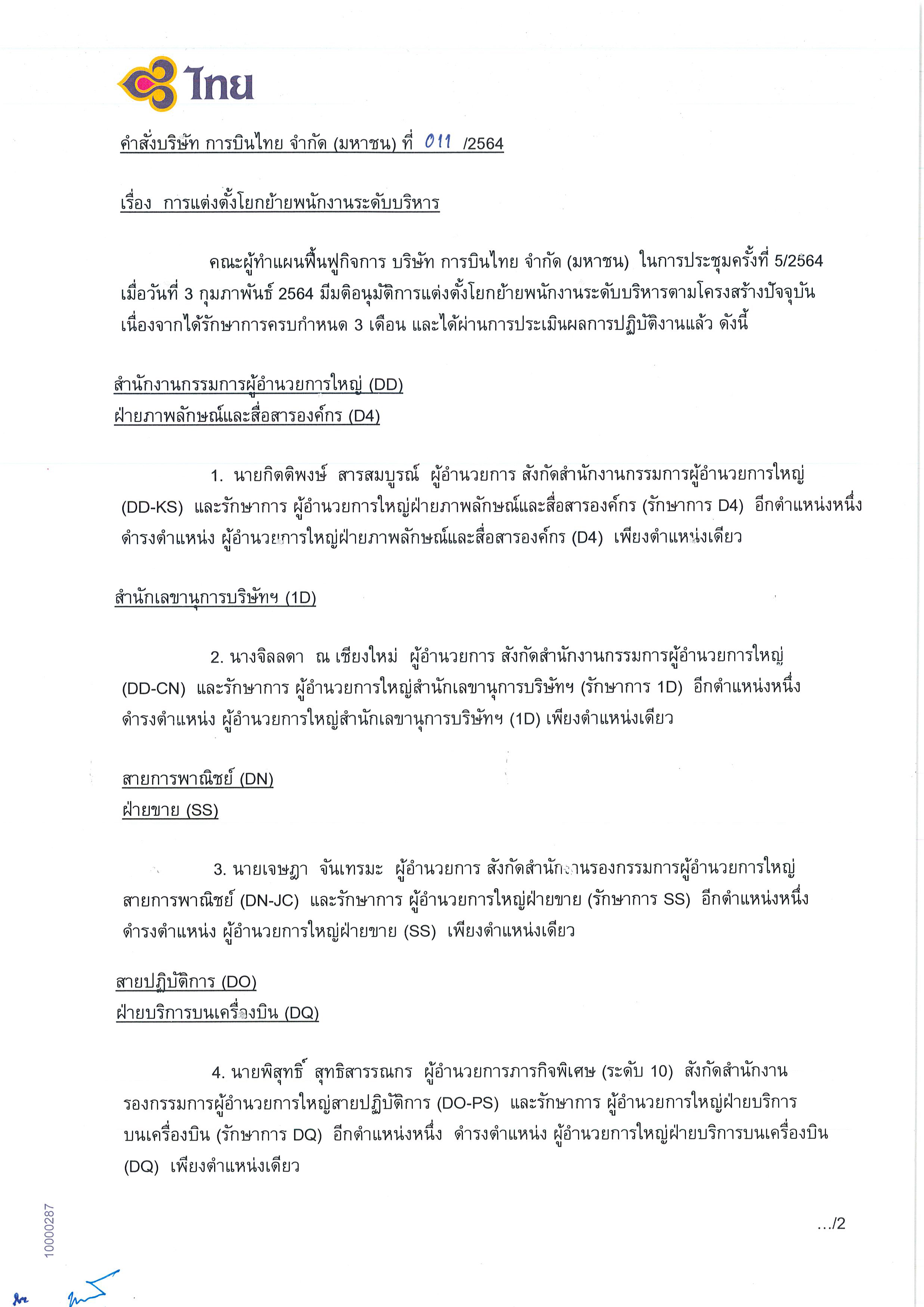 คำสั่งบริษัท การบินไทย ที่ 10/2564