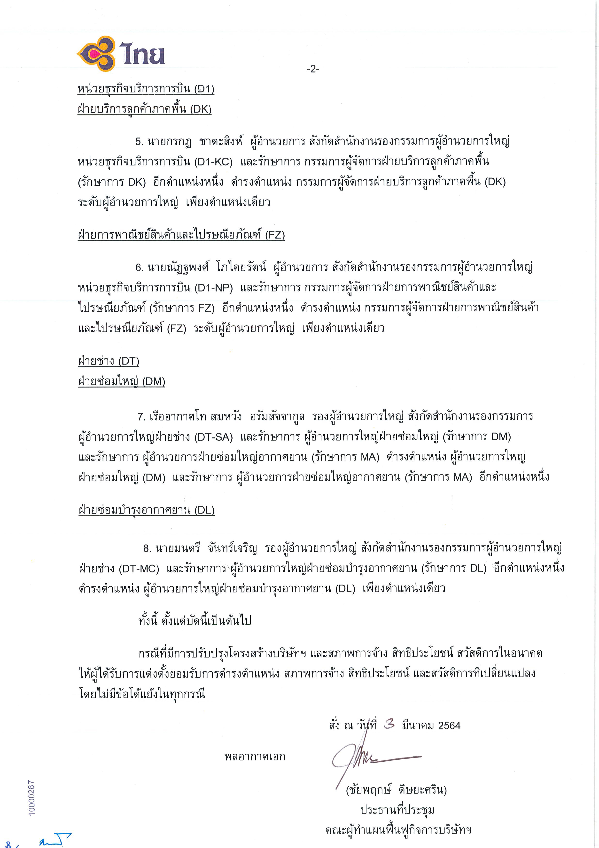 2.นายสุวรรธนะ สีบุญเรือง รองกรรมการผู้อำนวยการใหญ่หน่วยธุรกิจบริการการบิน (D1) ดำรงตำแหน่ง รักษาการ รองกรรมการผู้อำนวยการใหญ่สายทรัพยากรบุคคล (รักษาการ DB) อีกตำแหน่งหนึ่ง