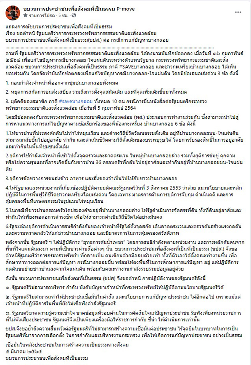 ผู้สื่อข่าวรายงานว่า เมื่อวันที่ 4 มี.ค.2564 ขบวนการประชาชนเพื่อสังคมที่เป็นธรรม (P-move) ออกแถลงการณ์ผ่านเพจเฟซบุ๊ก ขบวนการประชาชนเพื่อสังคมที่เป็นธรรม P-move เรื่อง ขอตำหนิ นายวราวุธ ศิลปอาชา รมว.กระทรวงทรัพยากรธรรมชาติและสิ่งแวดล้อม กรณีการแก้ปัญหาชาวบ้านบางกลอย โดยอ้างถึงบันทึการลงนามข้อตกลง ระหว่างตัวแทนรัฐบาล กับ ภาคี#Saveบางกลอย และชาวบ้านบางกลอย (อ่านประกอบ: 'ม็อบกะเหรี่ยง'ถอยกลับบางกลอย 17 ก.พ.'วราวุธ-ธรรมนัส'ยอมลงนามข้อตกลงร่วมภาคี)