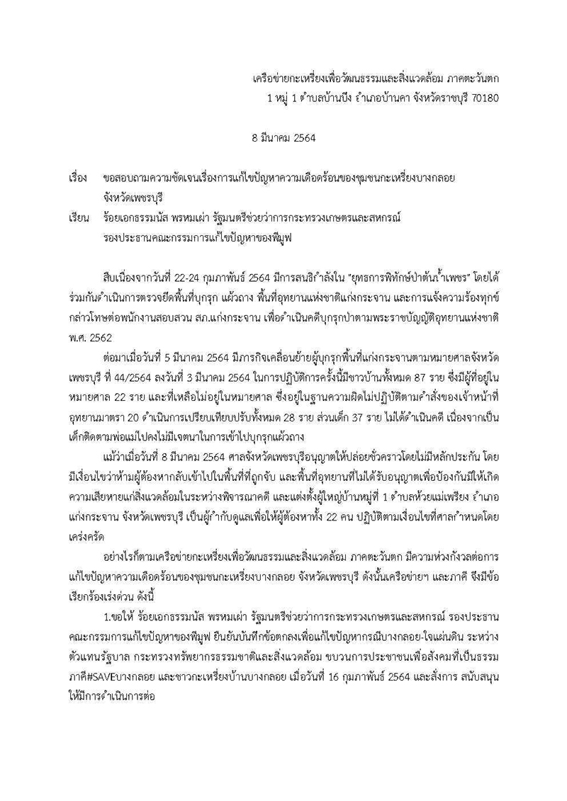 เครือข่ายกะเหรี่ยงเพื่อวัฒนธรรมและสิ่งแวดล้อมภาคตะวันตก ยื่นหนังสือถึง 'ธรรมนัส' แก้ปัญหาบางกลอยเร่งด่วน ด้านกลุ่มชมรมอนุรักษ์ฯ จังหวัดเพชรบุรียื่นหนังสือขอบคุณปฎิบัติการยุทธการพิทักษ์ป่าต้นน้ำเพชร