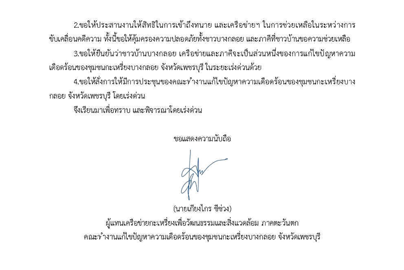 3.ขอให้ยืนยันว่าชาวบ้านบางกลอย เครือข่ายและภาคีจะเป็นส่วนหนึ่งของการแก้ไขปัญหาความเดือดร้อนของชุมชนกะเหรี่ยงบางกลอย จังหวัดเพชรบุรี ในระยะเร่งด่วนด้วย
