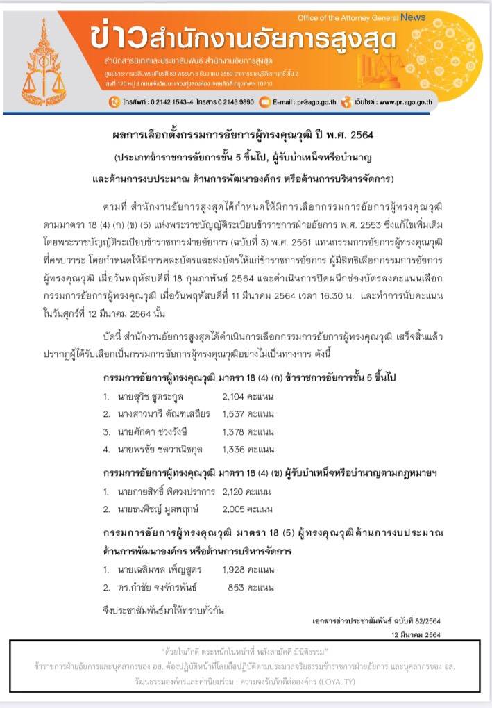 ผู้สื่อข่าวรายงานว่า เมื่อวันที่ 12 มี.ค. 2564 ที่ผ่านมา สำนักงานอัยการสูงสุด (อสส.) ทำการนับคะแนนการเลือกกรรมการอัยการ (ก.อ.) ผู้ทรงคุณวุฒิ แทนบุคคลที่ครบวาระ เป็นไปตามมาตรา 18 (4) (ก) (ข) (5) แห่ง พ.ร.บ.ระเบียบข้าราชการอัยการ พ.ศ. 2553 แก้ไขเพิ่มเติม (ฉบับที่ 3) พ.ศ. 2561 โดยกำหนดให้มีการคละบัตรและส่งบัตรให้แก่ข้าราชการอัยการ ผู้มีสิทธิเลือก ก.อ.ผู้ทรงคุณวุฒิ ตั้งแต่วันที่ 18 ก.พ. 2564 และดำเนินการปิดผนึกช่องบัตรลงคะแนนเลือกเมื่อวันที่ 11 มี.ค. 2564 ที่ผ่านมานั้น