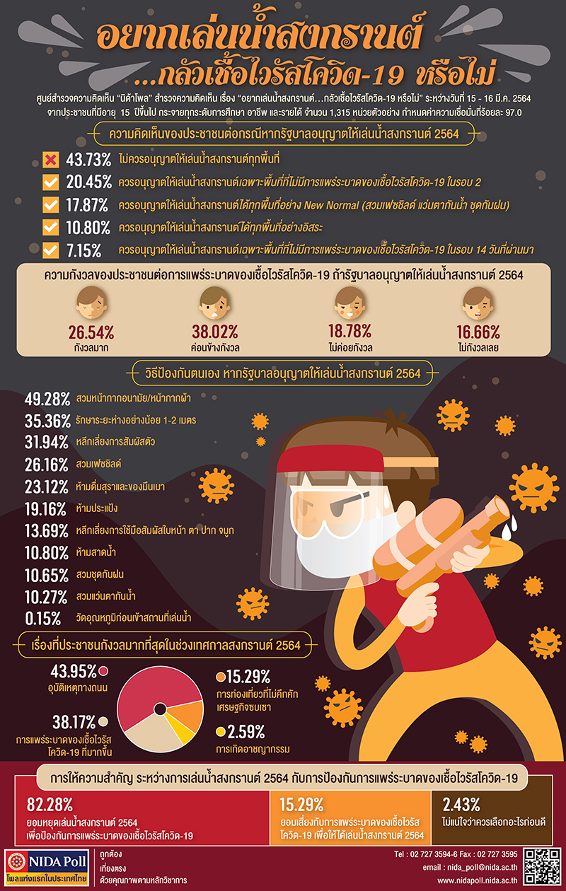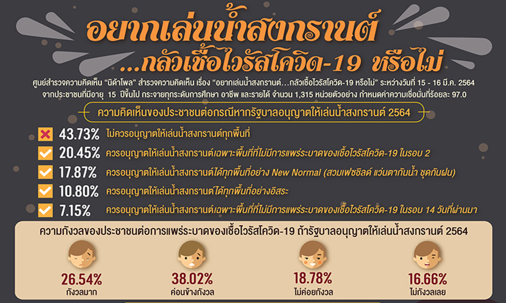 จากการสำรวจเมื่อถามถึงความคิดเห็นของประชาชนต่อกรณีหากรัฐบาลอนุญาตให้เล่นน้ำสงกรานต์ 2564 พบว่า ส่วนใหญ่ ร้อยละ 43.73 ระบุว่า ไม่ควรอนุญาตให้เล่นน้ำสงกรานต์ทุกพื้นที่ รองลงมา ร้อยละ 20.45 ระบุว่า ควรอนุญาตให้เล่นน้ำสงกรานต์เฉพาะพื้นที่ที่ไม่มีการแพร่ระบาดของเชื้อไวรัสโควิด-19 ในรอบ 2 ร้อยละ 17.87 ระบุว่า ควรอนุญาตให้เล่นน้ำสงกรานต์ได้ทุกพื้นที่อย่าง New Normal เช่น สวมเฟซชิลด์ แว่นตากันน้ำ ชุดกันฝน ร้อยละ 10.80 ระบุว่า ควรอนุญาตให้เล่นน้ำสงกรานต์ได้ทุกพื้นที่อย่างอิสระ และร้อยละ 7.15 ระบุว่า ควรอนุญาตให้เล่นน้ำสงกรานต์เฉพาะพื้นที่ที่ไม่มีการแพร่ระบาดของเชื้อไวรัสโควิด-19 ในรอบ 14 วันที่ผ่านมา