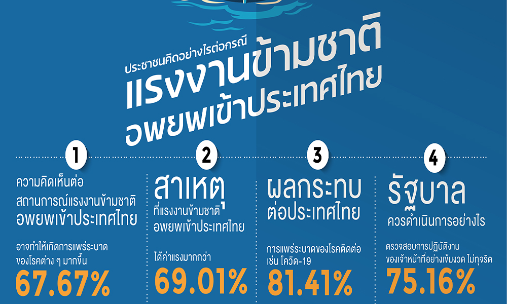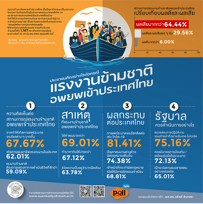 สวนดุสิตโพล มหาวิทยาลัยสวนดุสิต สำรวจความคิดเห็นของประชาชน เรื่อง “แรงงานข้ามชาติอพยพเข้าประเทศไทย” กลุ่มตัวอย่าง 1,167 คน สำรวจวันที่ 22 – 25 มีนาคม 2564 พบว่า กลุ่มตัวอย่างมองว่าการที่แรงงานข้ามชาติอพยพเข้าประเทศไทย อาจทำให้เกิดการแพร่ระบาดของโรคต่าง ๆ มากขึ้น ร้อยละ 67.67 สาเหตุที่แรงงานอพยพเข้าไทย เพราะได้ค่าแรงมากกว่า ร้อยละ 69.01 โดยผลกระทบที่อาจเกิดขึ้น คือ การแพร่ระบาดของโรคติดต่อ เช่น โควิด-19 ร้อยละ 81.41 สิ่งที่รัฐบาลควรดำเนินการคือ ตรวจสอบการปฏิบัติงานของเจ้าหน้าที่อย่างเข้มงวด ร้อยละ 75.16 และมองว่าการที่มีแรงงานอพยพเข้าไทยจำนวนมากนั้นมีผลเสียมากกว่า ร้อยละ 64.44