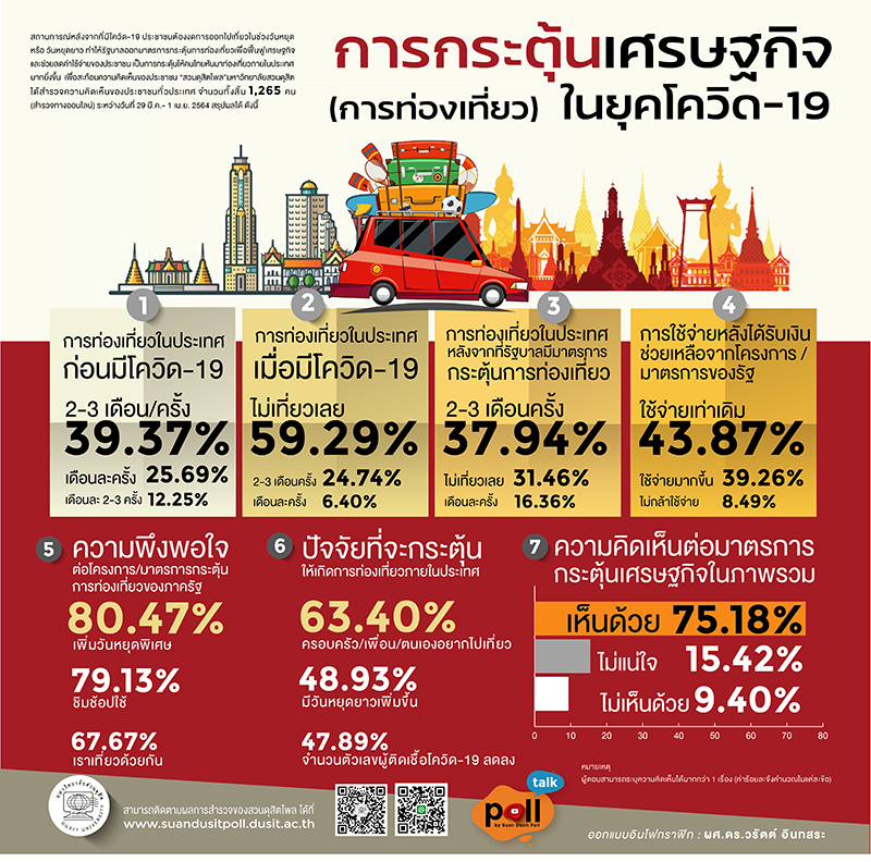 สวนดุสิตโพล มหาวิทยาลัยสวนดุสิต สำรวจความคิดเห็นของประชาชนต่อกรณี “การกระตุ้นเศรษฐกิจ (การท่องเที่ยว) ในยุคโควิด-19” กลุ่มตัวอย่างจำนวน 1,265 คน สำรวจวันที่ 29 มี.ค. – 1 เม.ย. 2564 พบว่า ก่อนมี โควิด-19 ประชาชนท่องเที่ยวประมาณ 2-3 เดือนครั้ง เมื่อมีโควิด-19 ไม่เที่ยวเลย แต่เมื่อมีมาตรการกระตุ้นการท่องเที่ยว ประชาชนท่องเที่ยว 2-3 เดือนครั้ง กรณีที่ได้รับเงินช่วยเหลือจากภาครัฐก็ยังคงใช้จ่ายเท่าเดิม ร้อยละ 43.87 โดยมาตรการกระตุ้นการท่องเที่ยวที่พึงพอใจมากที่สุด คือ การเพิ่มวันหยุดพิเศษ ร้อยละ 80.47 ปัจจัยที่ทำให้อยากไปท่องเที่ยว คือ ครอบครัว/เพื่อนและตนเองอยากไป ร้อยละ 63.40 รองลงมาคือ มีวันหยุดยาว ร้อยละ 48.93 และผู้ติดเชื้อโควิด-19 ลดลง ร้อยละ 47.89 ภาพรวมเห็นด้วยกับมาตรการกระตุ้นการท่องเที่ยว ร้อยละ 75.18