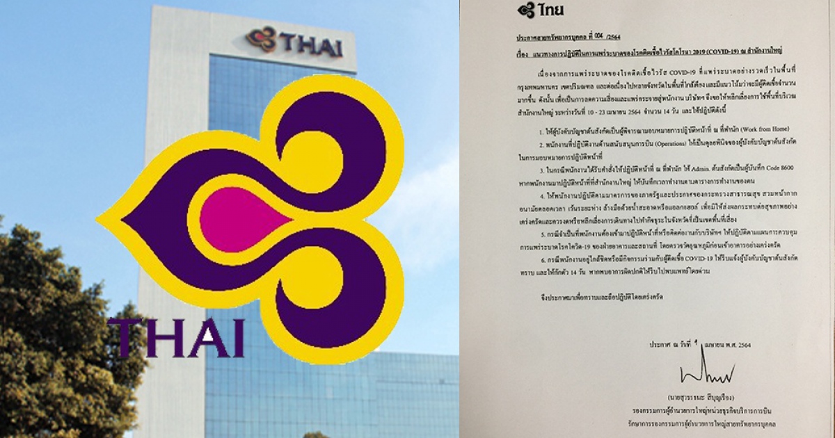 สำนักข่าวอิศรา (www.isranews.org) รายงานว่า เมื่อวันที่ 9 เม.ย.ที่ผ่านมา บริษัท การบินไทย จำกัด (มหาชน) ออกประกาศสายทรัพยากรบุคคล ที่ 004/2564 เรื่อง แนวทางการปฏิบัติในการแพร่ระบาดของโรคติดเชื้อไวรัสโคโรนา 2019 (COVID-19) ณ สำนักงานใหญ่ โดยระบุว่า เนื่องจากการแพร่ระบาคของโรคติดเชื้อไวรัส COVID-19 ที่แพร่ระบาดอย่างรวดเร็วในพื้นที่กรุงเทพมหานคร เขตปริมณฑล และต่อเนื่องไปหลายจังหวัดในพื้นที่ใกล้เคียง และมีแนวโน้มว่าจะมีผู้ติดเชื้อจำนวนมากขึ้น