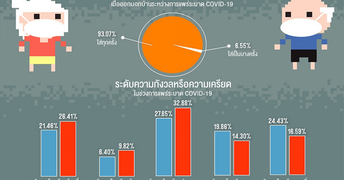 ด้านระดับความกังวลหรือความเครียดในช่วงการแพร่ระบาดของ COVID-19 ครั้งแรกเมื่อปีที่แล้ว (ระหว่างเดือนมีนาคม - พฤษภาคม 2563) ซึ่งมีการประกาศ พรก. ฉุกเฉิน และการ lockdown) พบว่า ผู้สูงวัย ร้อยละ 21.46 ระบุว่า มีความกังวลหรือความเครียดน้อยที่สุด (1 – 2 คะแนน) ร้อยละ 6.40 ระบุว่า มีความกังวลหรือความเครียดน้อย (3 – 4 คะแนน) ร้อยละ 27.85 ระบุว่า มีความกังวลหรือความเครียดปานกลาง (5 – 6 คะแนน) ร้อยละ 19.86 ระบุว่า มีความกังวลหรือความเครียดมาก (7 – 8 คะแนน) และร้อยละ 24.43 ระบุว่า มีความกังวลหรือความเครียดมากที่สุด (9 – 10 คะแนน)