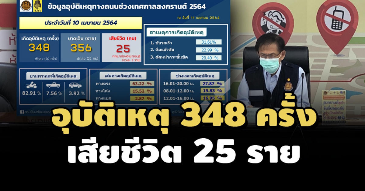 ผู้สื่อข่าวรายงานว่า เมื่อวันที่ 11 เม.ย. 2564 กรมป้องกันและบรรเทาสาธารณภัย ศูนย์อำนวยการป้องกันและลดอุบัติเหตุทางถนน (ศปถ.) ช่วงเทศกาลสงกรานต์ พ.ศ.2564 สรุปสถิติอุบัติเหตุทางถนนประจำวัน เกิดอุบัติเหตุ 348 ครั้ง ผู้เสียชีวิต 25 ราย ผู้บาดเจ็บ 356 คน โดยการขับรถเร็วยังคงเป็นสาเหตุที่ทำให้เกิดอุบัติเหตุสูงสุด รองลงมาดื่มแล้วขับ