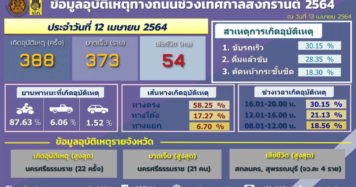 ผู้สื่อข่าวรายงานว่า เมื่อวันที่ 13 เม.ย. 2564 กรมป้องกันและบรรเทาสาธารณภัย ศูนย์อำนวยการป้องกันและลดอุบัติเหตุทางถนน (ศปถ.) ช่วงเทศกาลสงกรานต์ พ.ศ.2564 สรุปสถิติอุบัติเหตุทางถนนประจำวันที่ 12 เม.ย.ที่ผ่านมา เกิดอุบัติเหตุ 388 ครั้ง ผู้เสียชีวิต 54 ราย ผู้บาดเจ็บ 373 ราย สรุปสถิติ 3 วันของการรณรงค์ เกิดอุบัติเหตุรวม 1,090 ครั้ง ผู้เสียชีวิตรวม 110 ราย ผู้บาดเจ็บ รวม 1,099 ราย สำหรับจังหวัดที่ไม่มีผู้เสียชีวิต มีทั้งหมด 25 จังหวัด