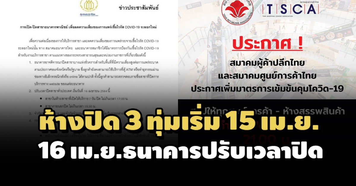 สมาคมผู้ค้าปลีกไทย - สมาคมศูนย์การค้าไทย ยกระดับมาตรการคุมโควิด ปิดทุกห้าง 3 ทุ่ม มีผลตั้งแต่ 15 เม.ย.เป็นต้นไป ส่วน ธนาคาร แจ้งปรับเวลาด้วย โดยสาขาในห้างปิด 17.00 น.เริ่ม 16 เม.ย.