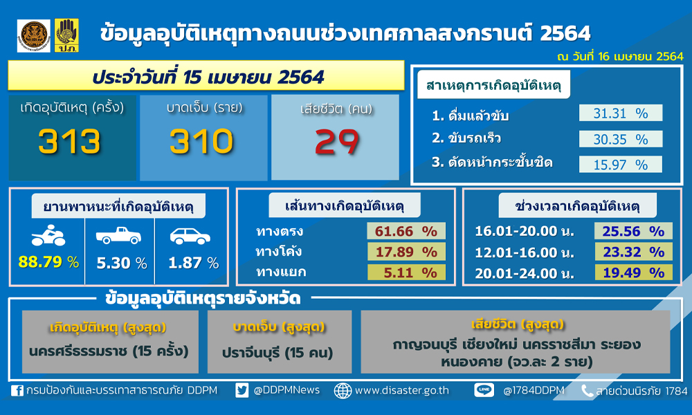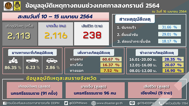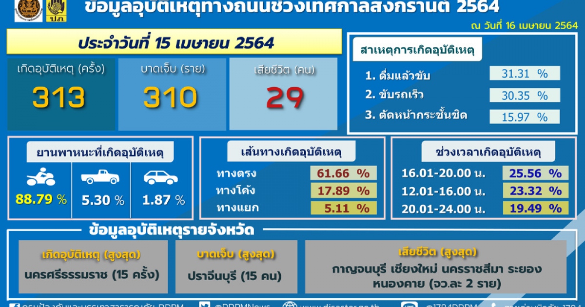 ผู้สื่อข่าวรายงานว่า เมื่อวันที่ 16 เม.ย. 2564 กรมป้องกันและบรรเทาสาธารณภัย ศูนย์อำนวยการป้องกันและลดอุบัติเหตุทางถนน (ศปถ.) ช่วงเทศกาลสงกรานต์ พ.ศ.2564 สรุปสถิติอุบัติเหตุทางถนนประจำวันที่ 15 เม.ย.ที่ผ่านมา เกิดอุบัติเหตุ 313 ครั้ง ผู้เสียชีวิต 29 ราย ผู้บาดเจ็บ 310 ราย สรุปอุบัติเหตุทางถนนสะสม ระหว่างวันที่ 10 - 15 เม.ย. เกิดอุบัติเหตุรวม 2,113 ครั้ง ผู้เสียชีวิตรวม 238 ราย ผู้บาดเจ็บ รวม 2,116 ราย จังหวัดที่ไม่มีผู้เสียชีวิตมี 8 จังหวัด