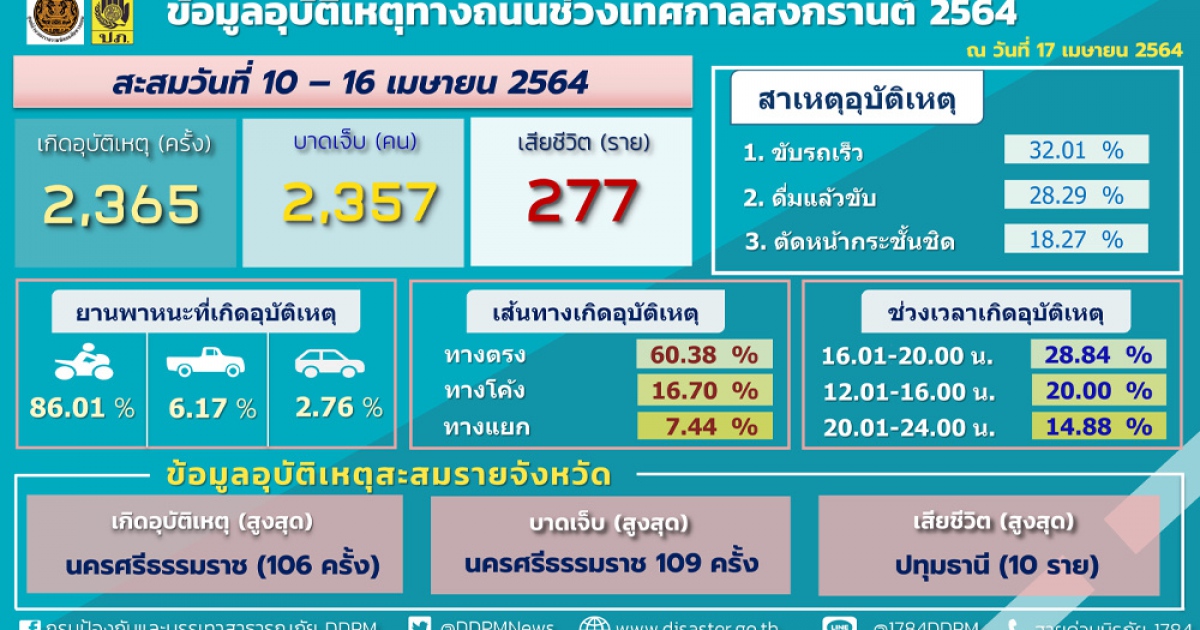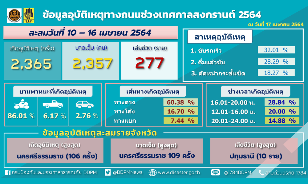 สรุปสถิติ 7 วันอันตรายช่วงสงกรานต์ เกิดอุบัติเหตุ 2,365 ครั้ง บาดเจ็บ 2,357 ราย สูงสุดที่ นครศรีธรรมราช ส่วนผู้เสียชีวิตสะสม 277 ราย สูงสุดที่ ปทุมธานี สาเหตุหลัก ยังเป็นขับรถเร็ว-เมาแล้วขับ
