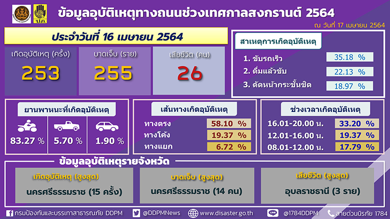ผู้สื่อข่าวรายงานว่า เมื่อวันที่ 17 เม.ย. 2564 กรมป้องกันและบรรเทาสาธารณภัย ศูนย์อำนวยการป้องกันและลดอุบัติเหตุทางถนน (ศปถ.) ช่วงเทศกาลสงกรานต์ พ.ศ.2564 สรุปสถิติอุบัติเหตุทางถนนประจำวันที่ 16 เม.ย.ที่ผ่านมา เกิดอุบัติเหตุ 253 ครั้ง ผู้เสียชีวิต 26 ราย ผู้บาดเจ็บ 255 ราย