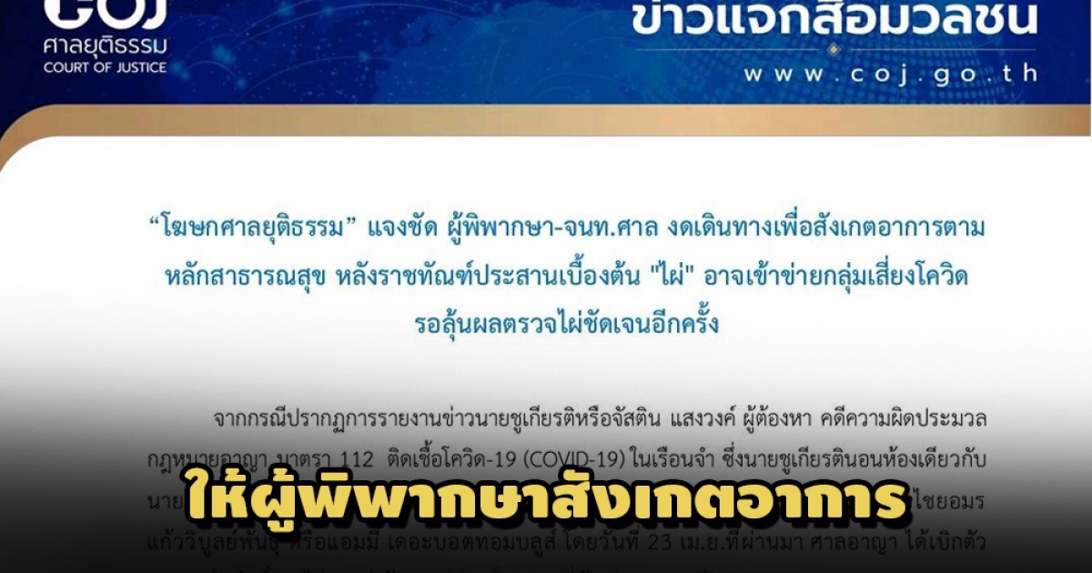 จากกรณีปรากฏการรายงานข่าวนายชูเกียรติหรือจัสติน แสงวงค์ ผู้ต้องหา คดีความผิดประมวลกฎหมายอาญา มาตรา 112 ติดเชื้อโควิด-19 (COVID-19) ในเรือนจำ ซึ่งนายชูเกียรตินอนห้องเดียวกับนายพริษฐ์ หรือเพนกวิน ชิวารักษ์, นายจตุภัทร์ หรือไผ่ดาวดิน บุญภัทรรักษา และนายไชยอมร แก้ววิบูลย์พันธุ์ หรือแอมมี่ เดอะบอตทอมบลูส์ โดยวันที่ 23 เม.ย.ที่ผ่านมา ศาลอาญา ได้เบิกตัว นายจตุภัทร์ เพื่อมาไต่สวนคำร้องขอปล่อยชั่วคราว ที่ห้องพิจารณาคดี 912