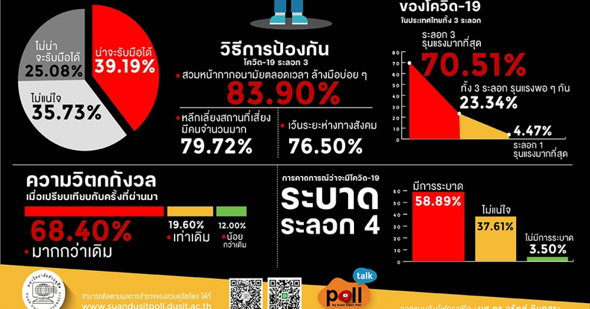จากผลการสำรวจประชาชนมองว่าการระบาดระลอกนี้รุนแรงขยายวงกว้างรวดเร็วกว่าที่ผ่านมา ถึงแม้จะเริ่ม คุ้นชินกับสถานการณ์ แต่ก็ยังกังวลเรื่องการติดเชื้อและผลกระทบที่จะเกิดขึ้น รัฐบาลควรเพิ่มมาตรการเชิงรุก การตรวจหาเชื้ออย่างทั่วถึง และการเร่งฉีดวัคซีนที่มีประสิทธิภาพ การรับมือที่ล่าช้าเช่นนี้จึงกังวลว่าอาจจะมีการระบาดระลอก 4 ตามมา