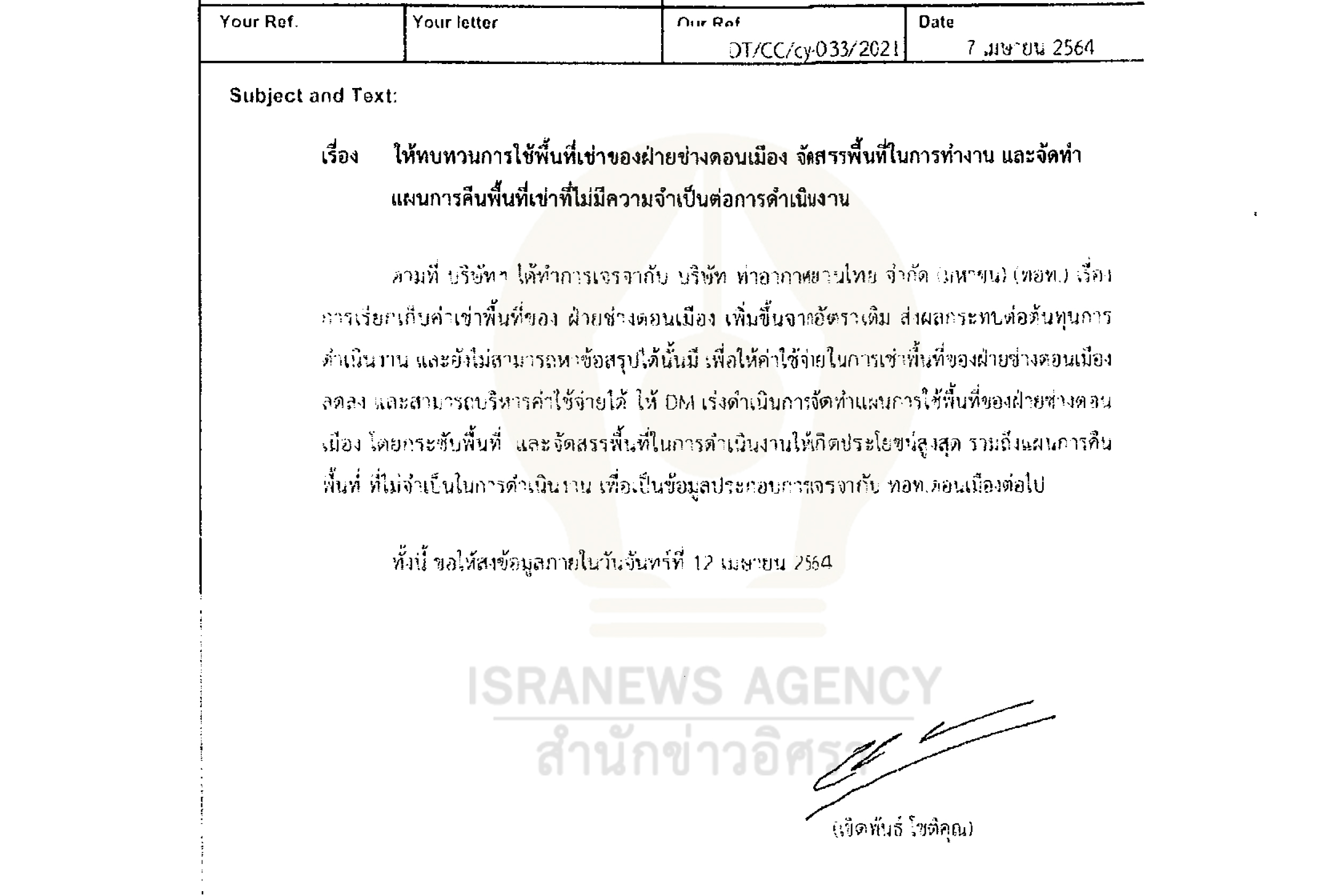 “เพื่อให้ค่าใช้จ่ายในการเช่าพื้นที่ของฝ่ายช่าง ดอนเมือง ลดลง และสามารถบริหารค่าใช้จ่ายได้ ให้ฝ่ายซ่อมใหญ่ (DM) เร่งดำเนินการจัดทำแผนการใช้พื้นที่ของฝ่ายช่างดอนเมือง โดยกระชับพื้นที่และจัดสรรพื้นที่ในการดำเนินงานให้เกิดประโยชน์สูงสุด รวมทั้งแผนคืนพื้นที่ที่ไม่จำเป็นในการดำเนินงาน เพื่อเป็นข้อมูลประกอบการเจรจากับ ทอท. ดอนเมืองต่อไป” รายงานข่าวจากบริษัท การบินไทย ระบุ
