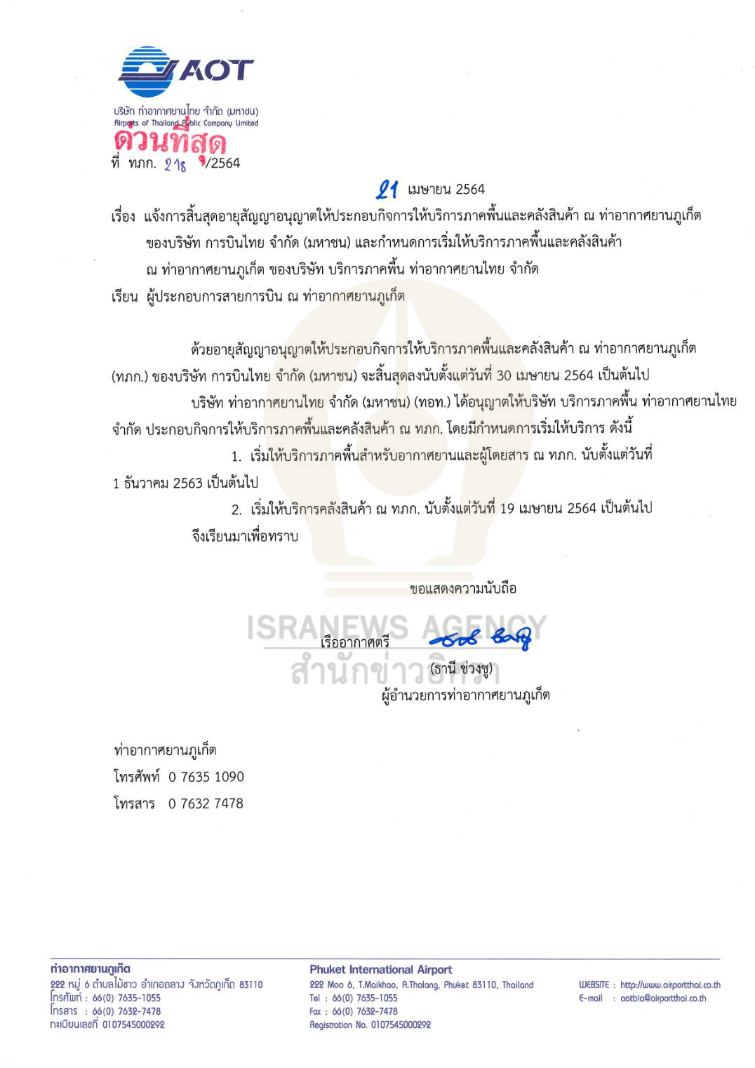สำนักข่าวอิศรารายงานเพิ่มเติมว่า เมื่อวันที่ 21 เม.ย.ที่ผ่านมา ทอท.มีหนังสือถึงบริษัท การบินไทย โดยหนังสือดังกล่าวเป็นการแจ้งการสิ้นสุดสัญญาอนุญาตให้การประกอบกิจการให้บริการภาคพื้นดินและคลังสินค้า ณ ท่าอากาศยานภูเก็ต ของบริษัท การบินไทย จำกัด (มหาชน) ซึ่งจะสิ้นสุดลงในวันที่ 30 เม.ย.2564 เป็นต้นไป และกำหนดการเริ่มให้บริการภาคพื้นและคลังสินค้า ณ ท่าอากาศยานภูเก็ต ของบริษัท บริการภาคพื้น ท่าอากาศยานไทย จำกัด