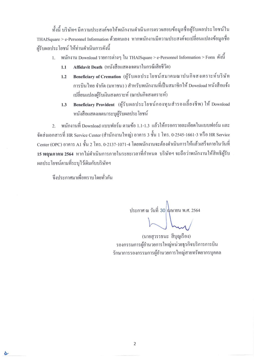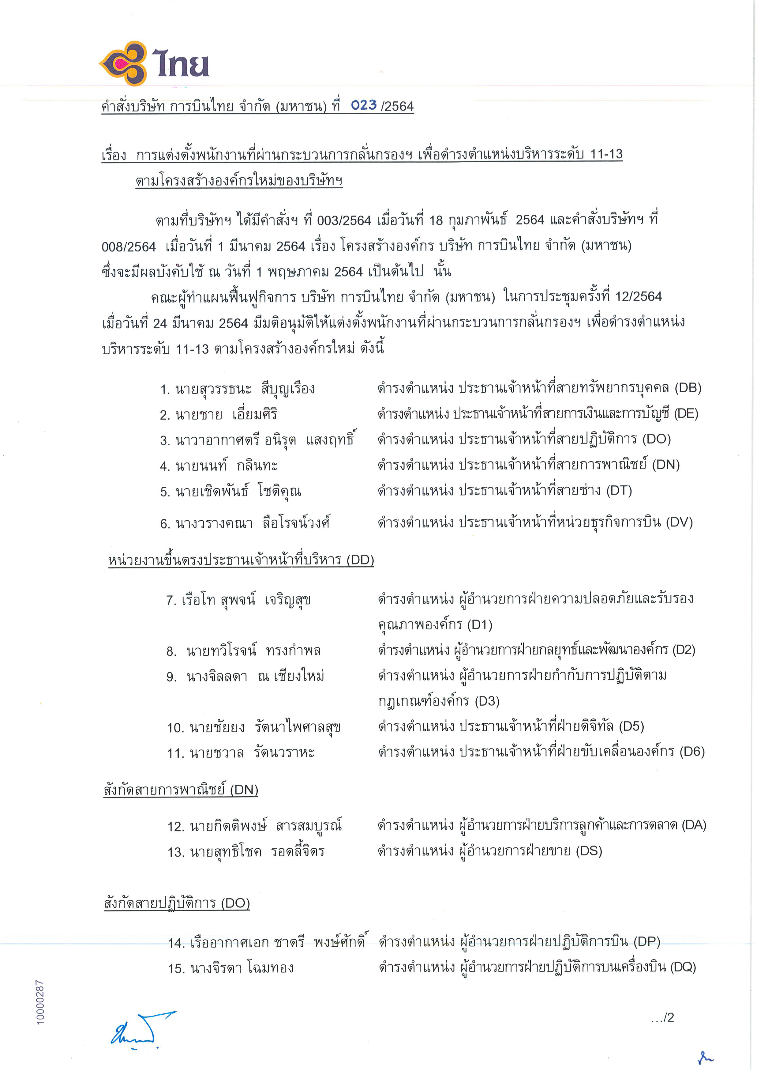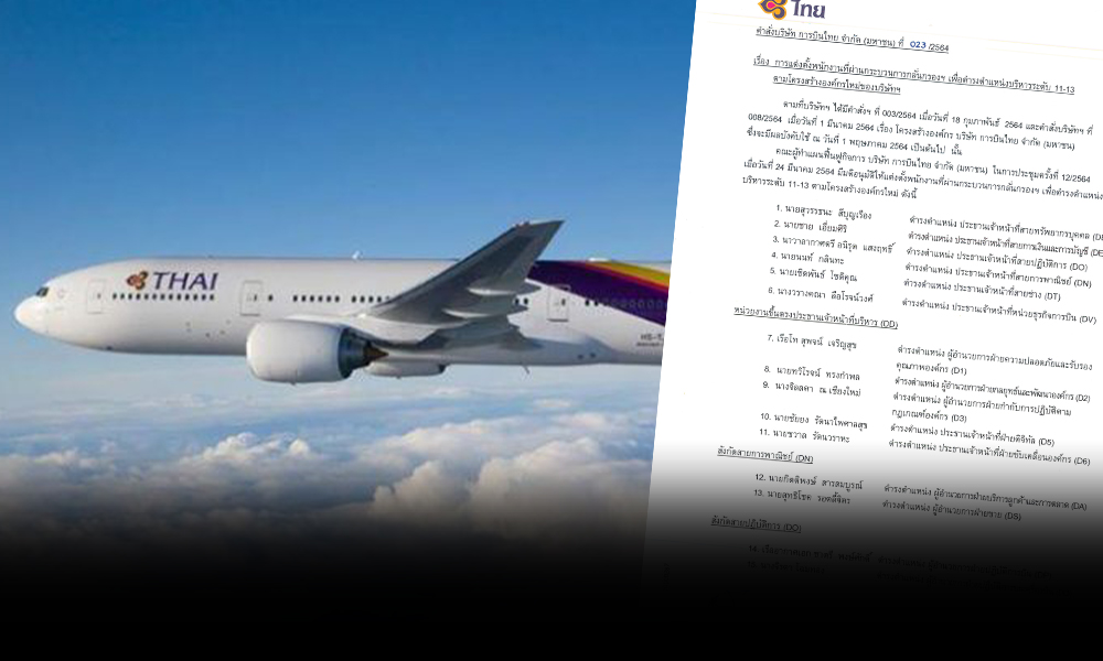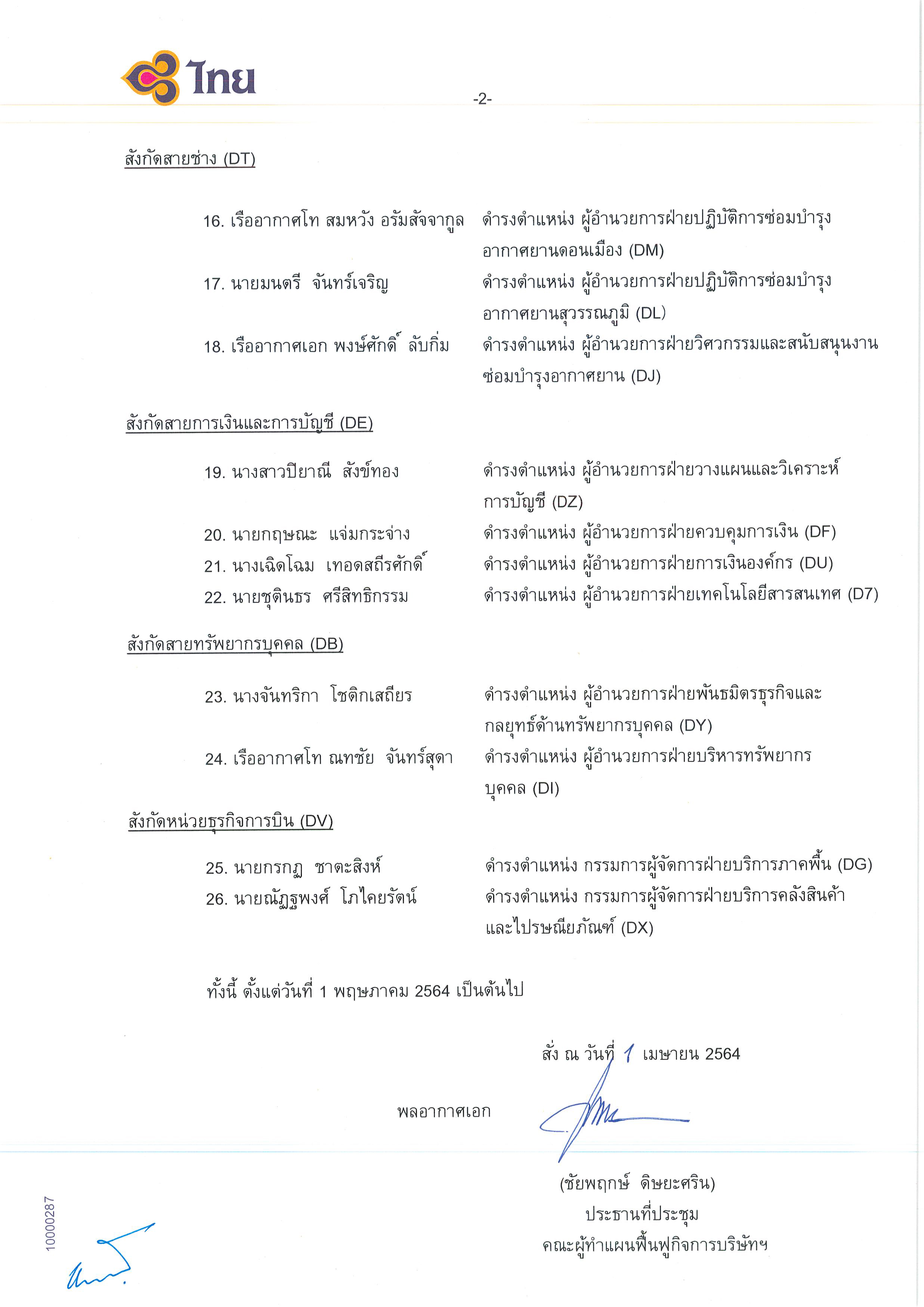 ‘การบินไทย’ ประกาศแต่งตั้งผู้บริหารระดับสูงระดับ 11-13 รวม 26 ตำแหน่ง ตามโครงสร้างองค์กรใหม่ มีผลวันที่ 1 พ.ค.64
