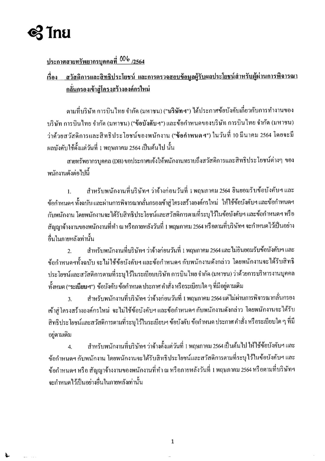 ขณะเดียวกัน เมื่อวันที่ 30 เม.ย. นายสุวรรธนะ สีบุญเรือง รองกรรมการผู้อำนวยการใหญ่หน่วยธุรกิจบริการการบิน และรักษาการรองกรรมการผู้อำนวยการใหญ่สายทรัพยากรบุคคล ลงนามประกาศสายทรัพยากรบุคคลที่ 006/2564 เรื่อง สวัสดิการและสิทธิประโยชน์ และการตรวจสอบข้อมูลผู้รับผลประโยชน์สำหรับผู้ผ่านการพิจารณากลั่นกรองเข้าสู่โครงสร้างองค์กรใหม่ ซึ่งแบ่งพนักงานเป็น 4 กลุ่ม ที่จะได้รับสวัสดิการและสิทธิประโยชน์แตกต่างกันตามข้อบังคับฉบับใหม่และฉบับเดิม