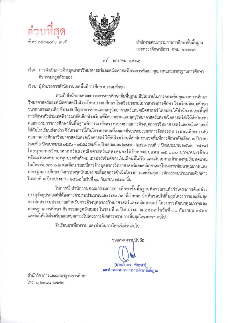 โดยเนื้อหาในหนังสือราชการดังกล่าว ระบุว่า สพฐ. มีนโยบายในการยกระดับคุณภาพการศึกษา วิทยาศาสตร์และคณิตศาสตร์ในโรงเรียนประถมศึกษา โรงเรียนขยายโอกาสทางการศึกษา โรงเรียนมัธยมศึกษา ขนาดกลางและเล็ก ที่ประสบปัญหาการขาดแคลนครูวิทยาศาสตร์และคณิตศาสตร์ โดยมอบให้ สํานักงานเขตพื้นที่การศึกษา (สพท.) ทั่วประเทศ พิจารณาคัดเลือกโรงเรียนที่มีความขาดแคลนครูวิทยาศาสตร์และคณิตศาสตร์ส่งให้สํานักงาน คณะกรรมการการศึกษาขั้นพื้นฐานพิจารณาจัดสรรงบประมาณการจ้างบุคลากรวิทยาศาสตร์และคณิตศาสตร์ ให้กับโรงเรียนดังกล่าว