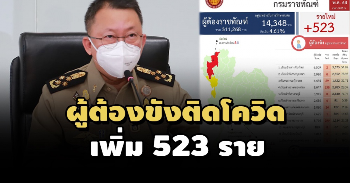 กรมราชทัณฑ์เผยยอดผู้ต้องขังติดเชื้อรายใหม่ 523 ราย รักษาหายเพิ่ม 218 ราย เหลืออยู่ระหว่างการรักษา 14,348 ราย จากการตรวจหาเชื้อไปแล้ว 37,288 ราย พร้อมตั้งเป้าฉีดวัคซีนเข็มแรกจนครบ 3,831 ราย ภายใน 1 สัปดาห์ เริ่มฉีดเรือนจำพิเศษมีนบุรีแห่งแรก 1,500 ราย