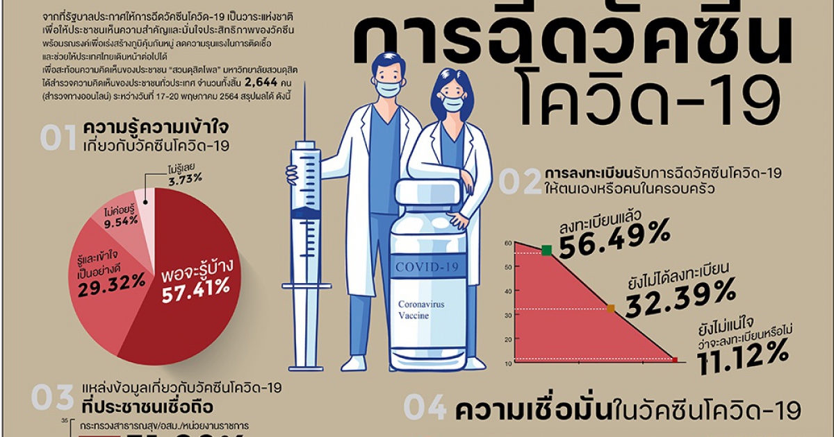 สวนดุสิตโพล มหาวิทยาลัยสวนดุสิต สำรวจความคิดเห็นของประชาชนต่อกรณี “การฉีดวัคซีนโควิด-19” กลุ่มตัวอย่างจำนวน 2,644 คน สำรวจวันที่ 17-20 พฤษภาคม 2564 พบว่า ประชาชนพอจะมีความรู้เข้าใจเกี่ยวกับวัคซีนโควิด-19 ร้อยละ 57.41 รู้และเข้าใจเป็นอย่างดี ร้อยละ 29.32 โดยร้อยละ 56.49 ได้ลงทะเบียนรับการฉีดวัคซีนให้ตนเองหรือคนในครอบครัวแล้ว แหล่งข้อมูลที่เชื่อถือมากที่สุด คือ กระทรวงสาธารณสุข อสม. และหน่วยงานราชการ ร้อยละ 31.02 โดยเชื่อมั่นวัคซีนของบริษัทไฟเซอร์มากที่สุด ร้อยละ 75.11 รองลงมาคือ โมเดอร์นา ร้อยละ 72.14 ทั้งนี้ยังกังวลเรื่องผลข้างเคียงของวัคซีน ร้อยละ 59.64 โดยอยากให้กลุ่มแพทย์ออกมาชี้แจง ร้อยละ 67.74 และตัดสินใจว่าจะไปฉีดวัคซีน ร้อยละ 64.39