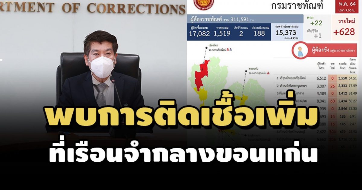 กรมราชทัณฑ์รายงานผู้ต้องขังติดเชื้อรายใหม่ 628 ราย รักษาหาย 22 ราย เสียชีวิต 1 ราย อยู่ระหว่างการรักษา 15,373 ราย โดยพบการติดเชื้อเพิ่ม 1 เรือนจำ คือ เรือนจำกลางขอนแก่น รวม 13 แห่ง พร้อมวางแผนการรักษาเชิงรุกซ้ำเพื่อป้องกันการเสียชีวิต