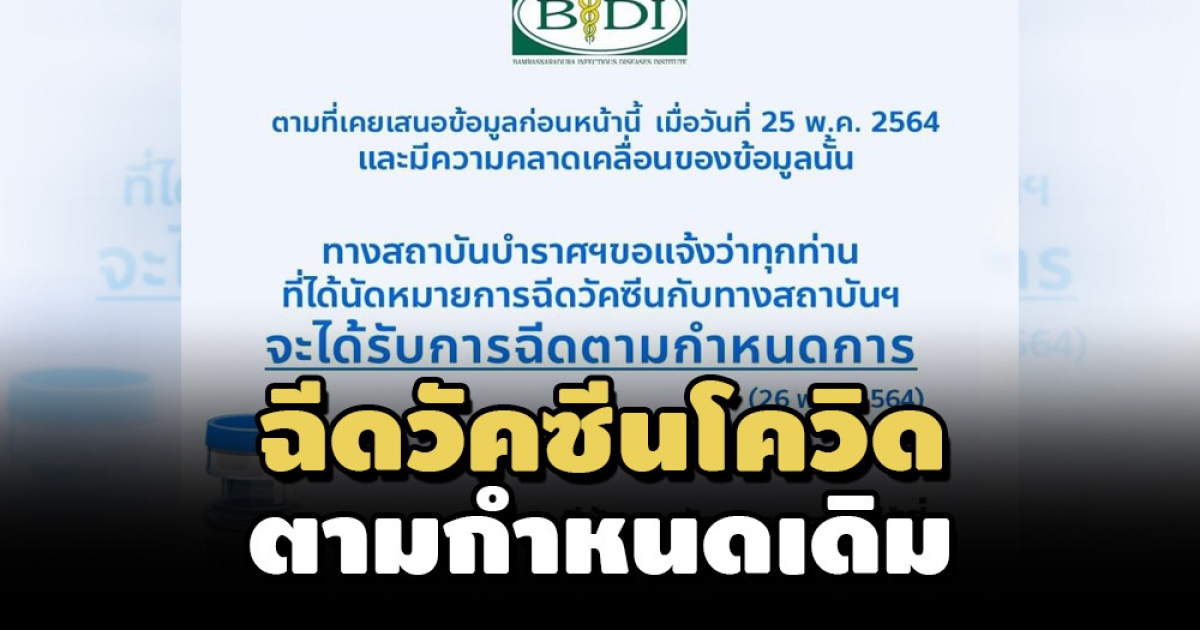 ล่าสุด สถาบันบำราศนราดูร เผยแพร่ข้อมูลผ่านเพจเฟซบุ๊ก สถาบันบำราศนราดูร กรมควบคุมโรค ระบุว่า ตามที่เคยเสนอข้อมูลก่อนหน้านี้ เมื่อวันที่ 25 พ.ค.และมีความคลาดเคลื่อนของข้อมูลนั้น ทางสถานบันฯ ขอแจ้งว่าสำหรับบุคคลที่ได้นัดหมายการฉีดวัคซีนกับทางสถาบันจะได้รับการฉีดตามกำหนดการเดิม