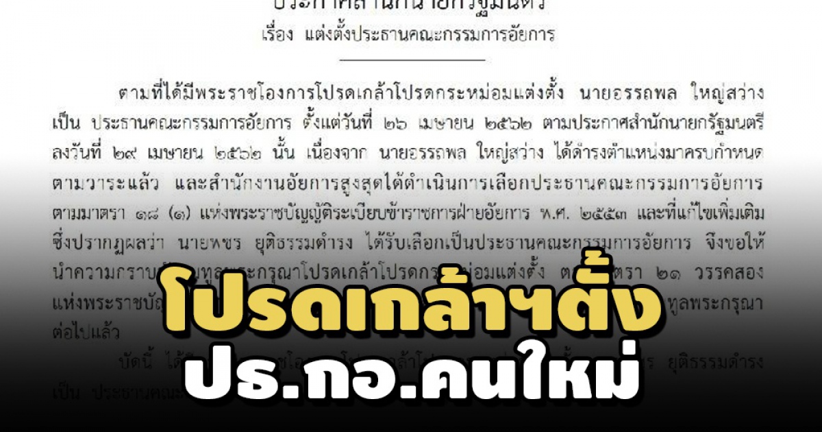 ตามที่มีพระราชโองการโปรดเกล้าฯ แต่งตั้งนายอรรถพล ใหญ่สว่าง เป็นประธานคณะกรรมการอัยการ (ประธาน ก.อ.) ตั้งแต่วันที่ 26 เม.ย. 2562 ตามประกาศสำนักนายกรัฐมนตรี ลงวันที่ 29 เม.ย. 2562 นั้น เนื่องจากนายอรรถพล ได้ดำรงตำแหน่งมาครบกำหนดตามวาระแล้ว และสำนักงานอัยการสูงสุด (อสส.) ดำเนินการเลือกประธาน ก.อ. ตามมาตรา 18 (1) แห่ง พ.ร.บ.ระเบียบข้าราชการฝ่ายอัยการ พ.ศ. 2553 และที่แก้ไขเพิ่มเติม ปรากฏว่า นายพชร ยุติธรรมดำรง ได้รับเลือกเป็นประธาน ก.อ. จึงขอให้นำความกราบบังคมทูลพระกรุณาโปรดเกล้าฯแต่งตั้ง ตามมาตรา 21 วรรคสองแห่ง พ.ร.บ.ดังกล่าว และสำนักเลขาธิการคณะรัฐมนตรีได้นำความกราบบังคมทูลพระกรุณาต่อไปแล้ว