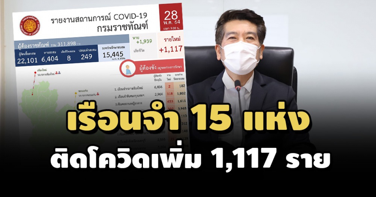 ผู้สื่อข่าวรายงานว่า เมื่อวันที่ 28 พ.ค. 2564 เวลา 14.00 น.นายวีระกิตติ์ หาญปริพรรณ์ รองอธิบดีกรมราชทัณฑ์และโฆษก ศบค.รท. เผยสถานการณ์การแพร่ระบาดของโรคติดเชื้อโควิดในเรือนจำและทัณฑสถาน ว่า มีผู้ต้องขังติดเชื้อรายใหม่จำนวน 1,1 17 ราย รักษาหาย 1,939 ราย ทำให้มีผู้ต้องขังที่ยังติดเชื้ออยู่ในการดูแลของกรมราชทัณฑ์ 15,445 ราย และพบผู้ติดเชื้อในเรือนจำจังหวัดตรังเพิ่ม 1 แห่ง รวมเรือนจำและทัณฑสถานที่ยังมีผู้ติดเชื้อ จำนวน 15 แห่ง ดังนี้