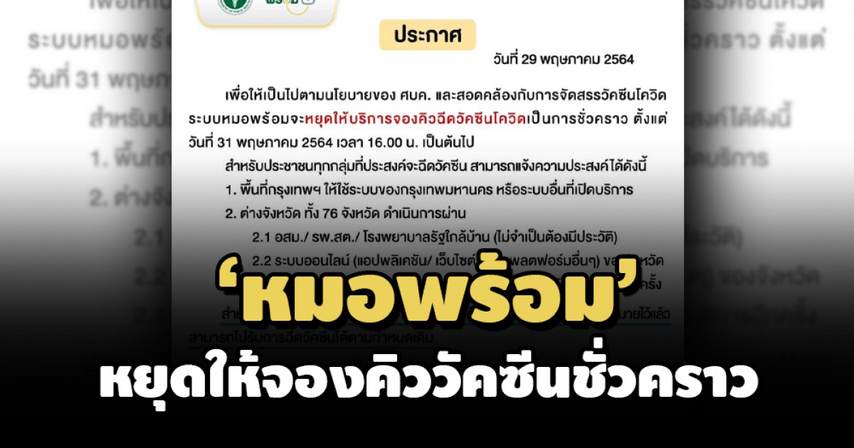 ผู้สื่อข่าวรายงานว่า เมื่อวันที่ 29 พ.ค.2564 เพจเฟซบุ๊กหมอพร้อม ออกประกาศ ระบุว่า เพื่อให้เป็นไปตามนโยบายของศูนย์บริหารสถานการณ์โควิด (ศบค.) และสอดคล้องกับการจัดสรรวัคซีนโควิด ระบบหมอพร้อมจะ หยุดให้บริการจองคิวฉีดวัคซีนเป็นการชั่วคราว ตั้งแต่ 31 พ.ค.2564 เวลา 16.00 น. เป็นต้นไป