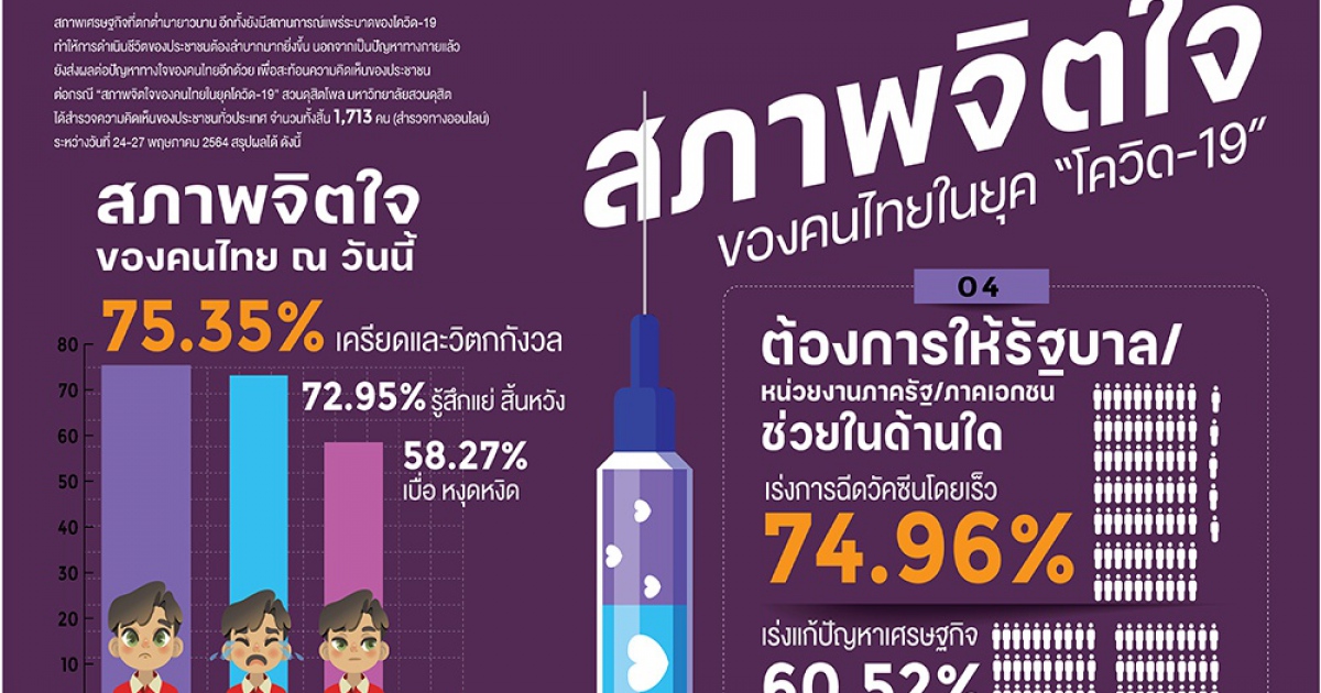 สวนดุสิตโพล มหาวิทยาลัยสวนดุสิต สำรวจความคิดเห็นของประชาชนต่อกรณี “สภาพจิตใจของคนไทยในยุค โควิด-19” กลุ่มตัวอย่างจำนวน 1,713 คน สำรวจวันที่ 24-27 พฤษภาคม 2564 พบว่า ประชาชนรู้สึกเครียดและวิตกกังวลมากที่สุด ร้อยละ 75.35 รองลงมาคือรู้สึกแย่ สิ้นหวัง ร้อยละ 72.95 สิ่งที่ทำให้สภาพจิตใจแย่ลง คือ การแพร่ระบาดของโควิด-19 รุนแรงมากขึ้น ร้อยละ 88.33 สภาพเศรษฐกิจตกต่ำ ทำมาหากินลำบาก ร้อยละ 74.53 วิธีการดูแลสภาพจิตใจ คือ การใช้ชีวิตด้วยความระมัดระวัง มีสติ ร้อยละ 91.03 ศึกษาวิธีป้องกันดูแลด้วยตัวเอง ร้อยละ 60.82 สิ่งที่อยากให้รัฐบาล/หน่วยงานภาครัฐ/ภาคเอกชนเข้ามาช่วยมากที่สุด คือ เร่งการฉีดวัคซีนโดยเร็ว ร้อยละ 74.96% เร่งแก้ปัญหาเศรษฐกิจ ร้อยละ 60.52 จากปัญหาที่เกิดขึ้นโดยภาพรวมประชาชนพยายามอดทน แก้ปัญหาเพื่อให้อยู่ได้ ร้อยละ 41.97