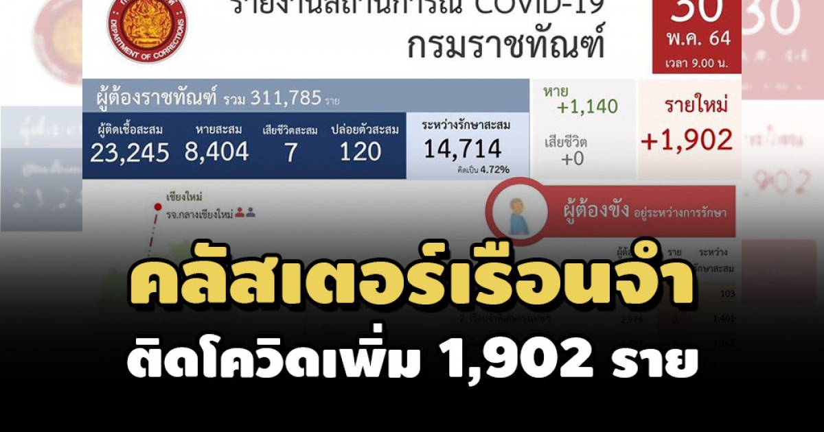ผู้สื่อข่าวรายงานว่า เมื่อวันที่ 30 พ.ค. 2564 เวลา 14.00 น. ศบค. กรมราชทัณฑ์ เผยสถานการณ์การแพร่ระบาดของโรคติดเชื้อไวรัสโควิดในเรือนจำและทัณฑสถาน ข้อมูล ณ วันที่ 29 พ.ค. 2564 เวลา 18.00 น. มีผู้ต้องขังติดเชื้อรายใหม่ จำนวน 1,902 ราย รักษาหาย 1,140 ราย มาจากเรือนจำคลองเปรม 339 ราย เรือจำกลางฉะเชิงเทรา 56 ราย ทัณฑสถานบำบัดพิเศษกลาง 55 ราย เรือนจำกลางบางขวาง 1,350 ราย และเรือนจำจังหวัดสงขลา 42 ราย ทำให้มีผู้ต้องขังที่ยังติดเชื้ออยู่ในการดูแลของกรมราชทัณฑ์ 14,714 ราย