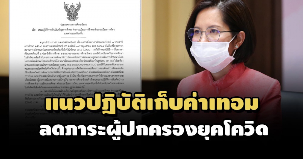 น.ส.ตรีนุช กล่าวต่อไปว่า ในประกาศดังกล่าวระบุ ว่า อนุสนธิประกาศ ศธ. เรื่อง การเลื่อนเวลาเปิดภาคเรียนที่ 1 ประจำปีการศึกษา 2564 ลงวันที่ 19 พ.ค. 2564 เนื่องมาจากสถานการณ์การแพร่ระบาดของโรคติดเชื้อไวรัสโควิด และให้โรงเรียนหรือสถานศึกษาในสังกัดและในกำกับของ ศธ.จัดการเรียนการสอนเฉพาะรูปแบบการจัดการศึกษาทางไกล โดยบางโรงเรียนหรือสถานศึกษาที่มีความพร้อมและประสงค์จะจัดการศึกษาในรูปแบบ On Site หรือ เรียนที่โรงเรียน ได้จะต้องผ่านเกณฑ์การประเมินความพร้อมของระบบ Thai StopCOVID Plus (TSC+) และได้รับความเห็นชอบจากคณะกรรมการโรคติดต่อจังหวัดก่อน นั้น ด้วยรูปแบบการจัดกิจกรรมการเรียนการสอนดังกล่าว ประกอบกับมีโรงเรียนหรือสถานศึกษาบางแห่งได้มีการเรียกเก็บเงินบำรุงการศึกษา ค่าธรรมเนียมการศึกษา ค่าธรรมเนียมการเรียน และค่าธรรมเนียมอื่นจากผู้ปกครอง ดังนั้น เพื่อเป็นการลดภาระค่าใช้จ่ายและบรรเทาความเดือดร้อนของผู้ปกครองในสถานการณ์ปัจจุบัน ศธ.กำหนดแนวปฏิบัติการเก็บเงินบำรุงการศึกษา ค่าธรรมเนียมการศึกษา ค่าธรรมเนียมการเรียน และค่าธรรมเนียมอื่น ให้โรงเรียนหรือสถานศึกษาในสังกัด หรือในกำกับของ ศธ.ถือปฏิบัติ