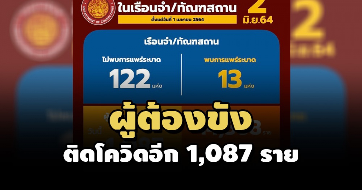 กรมราชทัณฑ์เผยยอดผู้ต้องขังติดโควิดเพิ่ม 1,087 ราย รักษาหายอีก 1,086 ราย เตรียมฉีดวัคซีนแก่ผู้ต้องขัง เริ่ม 3 มิ.ย.นี้ ย้ำตรวจหาเชื้อก่อนปล่อยตัว-พ้นโทษทุกราย