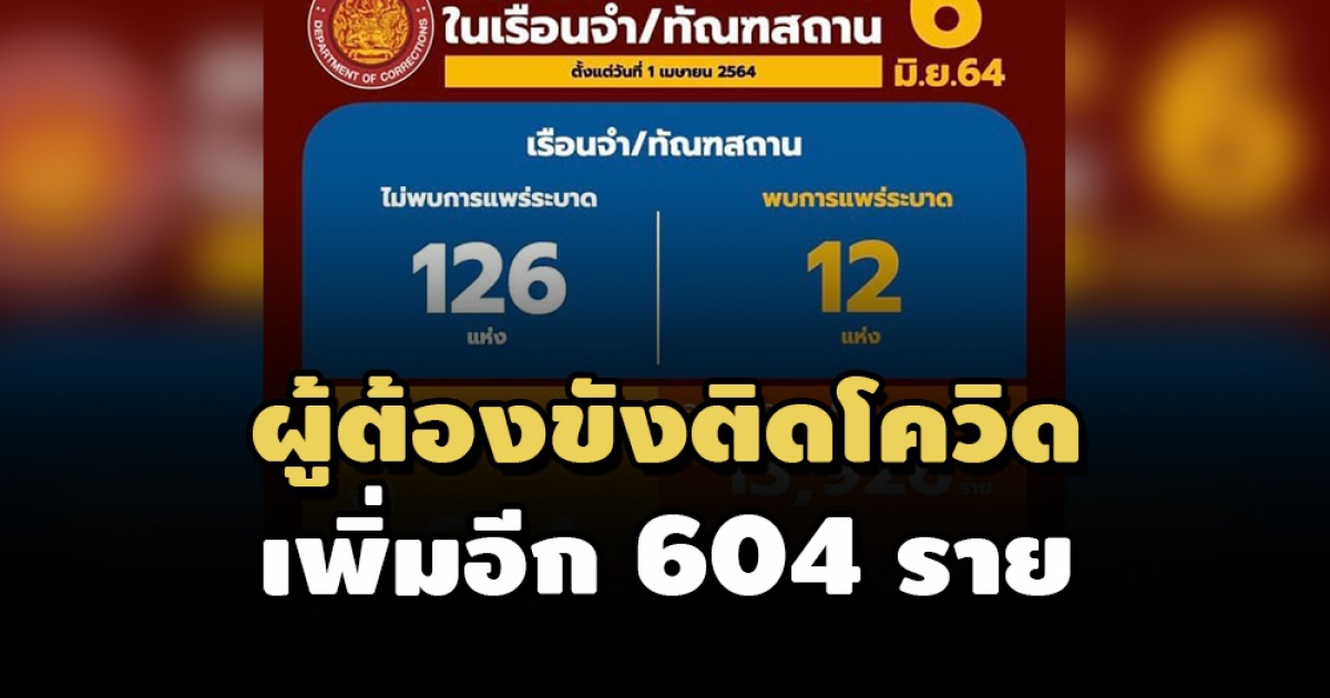 ผู้สื่อข่าวรายงานว่า เมื่อวันที่ 6 มิ.ย.2564 นายอายุตม์ สินธพพันธุ์ อธิบตีกรมราชทัณฑ์ เผยสถานการณ์การแพร่ระบาดของโรคติดเชื้อไวรัสโควิดในเรือนจำและทัณฑสถาน มีผู้ต้องขังติดเชื้อรายใหม่ จำนวน 604 ราย รักษาหายเพิ่ม 270 ราย ทำให้มีผู้ต้องขังติดเชื้อที่ยังอยู่ในการดูแลของกรมราชทัณฑ์ 13,926 ราย