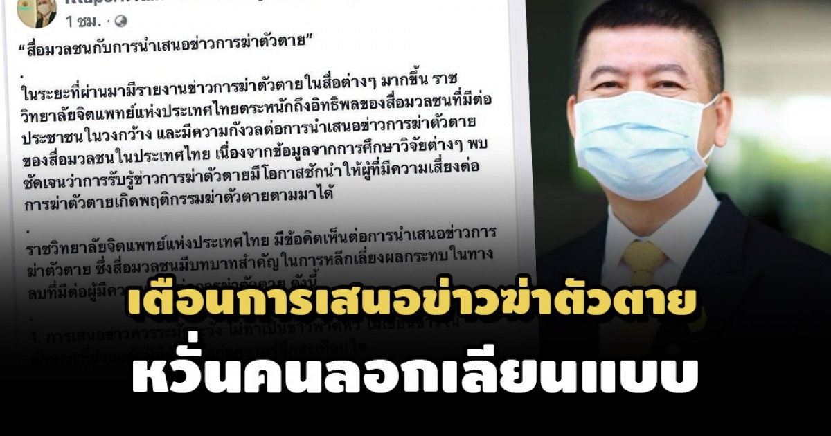 ผู้สื่อข่าวรายงานว่า เมื่อวันที่ 8 มิ.ย. 2564 พล.อ.ต.นพ.อิทธพร คณะเจริญ เลขาธิการแพทยสภา โพสต์ข้อความผ่านเฟซบุ๊ก Ittaporn Kanacharoen ระบุถึง ประกาศราชวิทยาลัยจิตแพทย์แห่งประเทศไทย เรื่องสื่อมวลชนกับการนำเสนอข่าวการฆ่าตัวตาย ว่า ในระยะที่ผ่านมามีรายงานข่าวการฆ่าตัวตายในสื่อต่างๆ มากขึ้น ราชวิทยาลัยจิตแพทย์แห่งประเทศไทยตระหนักถึงอิทธิพลของสื่อมวลชนที่มีต่อประชาชนในวงกว้าง และมีความกังวลต่อการนำเสนอข่าวการฆ่าตัวตายของสื่อมวลชนในประเทศไทย เนื่องจากข้อมูลจากการศึกษาวิจัยต่างๆ พบชัดเจนว่าการรับรู้ข่าวการฆ่าตัวตายมีโอกาสชักนำให้ผู้ที่มีความเสี่ยงต่อการฆ่าตัวตายเกิดพฤติกรรมฆ่าตัวตายตามมาได้