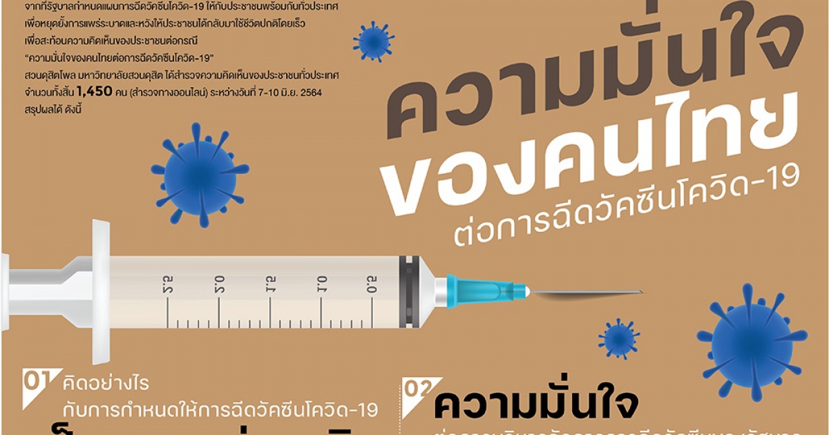 สวนดุสิตโพล มหาวิทยาลัยสวนดุสิต สำรวจความคิดเห็นของประชาชนต่อกรณี “ความมั่นใจของคนไทยต่อการฉีดวัคซีนโควิด-19” กลุ่มตัวอย่างจำนวน 1,450 คน สำรวจวันที่ 7-10 มิถุนายน 2564 พบว่า การกำหนดให้การฉีดวัคซีน เป็นวาระแห่งชาตินั้นเป็นเรื่องที่ควรดำเนินการโดยเร่งด่วน ร้อยละ 66.87 โดยประชาชนไม่ค่อยมั่นใจต่อการบริหารจัดการการฉีดวัคซีนของรัฐบาล ร้อยละ 36.36 และคิดว่าการตั้งเป้าฉีดวัคซีนให้ได้ 50 ล้านคน ครบ 100 ล้านโดส ภายในสิ้นปี 2564 ไม่น่าจะสำเร็จ ร้อยละ 57.61 มองว่าปัจจุบันปัญหาการฉีดวัคซีน คือ จำนวนวัคซีนไม่เพียงพอ ไม่หลากหลายยี่ห้อ ร้อยละ 77.87 ต้องนำเข้าวัคซีนให้มากขึ้น ร้อยละ 78.74 ทั้งนี้ไม่เห็นด้วยกับวัคซีนทางเลือกที่ประชาชนต้องจ่ายเงินเอง ร้อยละ 34.00 และไม่สนใจจะจองวัคซีนทางเลือก ร้อยละ 37.38