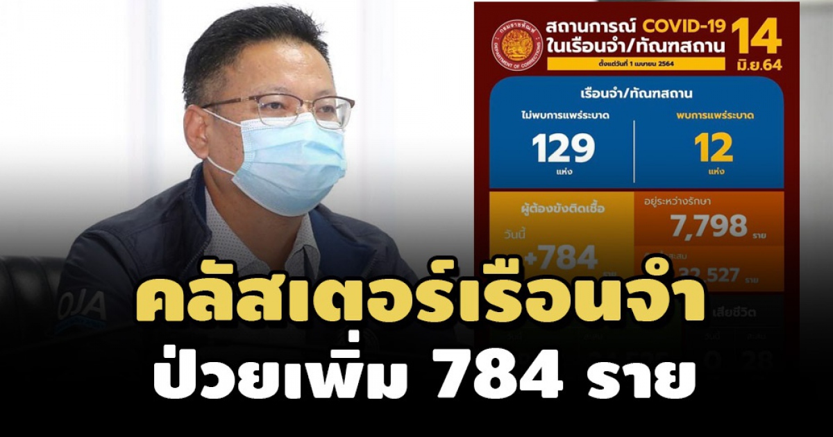 ผู้สื่อข่าวรายงานว่า เมื่อวันที่ 14 มิ.ย.2564 นายอายุตม์ สินธพพันธุ์ อธิบดีกรมราชทัณฑ์ เผยสถานการณ์การแพร่ระบาดของโรคติดเชื้อไวรัสโควิดในเรือนจำและทัณฑสถาน ว่า มีผู้ต้องขังติดเชื้อรายใหม่ จำนวน 784 ราย รักษาหายเพิ่ม 908 ราย ทำให้มีผู้ต้องขังติดเชื้อที่ยังอยู่ในการดูแลของกรมราชทัณฑ์ 7,798 ราย และไม่มีผู้เสียชีวิตในวันนี้