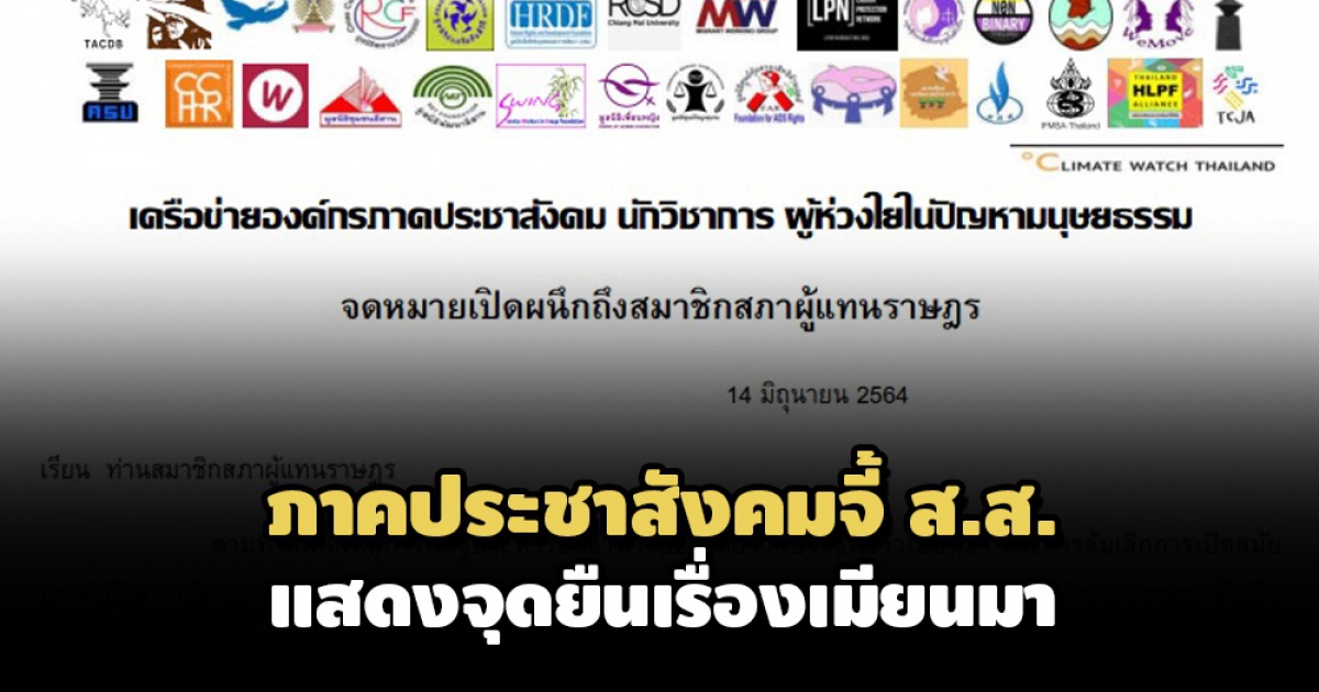 ผู้สื่อข่าวรายงานว่า เมื่อวันที่ 14 มิ.ย. 2564 เครือข่ายองค์กรภาคประชาสังคม นักวิชาการ ผู้ห่วงใยในปัญหามนุษยธรรม ทำจดหมายเปิดผนึกถึงสมาชิกสภาผู้แทนราษฎร เรียกร้องให้แสดงจุดยืนเรื่องเรียกร้องประชาธิปไตยในเมียนมา โดยระบุว่า ตามที่ได้เกิดเหตุการณ์รัฐประหารยึดอำนาจอธิปไตยจากปวงชนชาวเมียนมา และการล้มเลิกการเปิดสมัยประชุมรัฐสภาเมียนมา เมื่อวันที่ 1 กุมภาพันธ์ 2564 อันสืบเนื่องมาจากการเลือกตั้งทั่วไปเมื่อวันที่ 8 พฤศจิกายน 2563 ดังเป็นที่ทราบกันอยู่แล้วนั้น พวกเราบรรดาองค์กรภาคประชาสังคมที่มิใช่รัฐหรือมิค้ากำไร และเครือข่ายแวดวงวิชาการ นิสิต นักศึกษาสื่อมวลชน และผู้นำท้องถิ่น ได้มีโอกาสพบปะหารือกับฝ่ายต่างๆ ของเมียนมา และได้เพียรพยายามที่จะร่วมมือประสานกันในการให้ความช่วยเหลือทางด้านมนุษยธรรมต่อผู้หนีภัยจากเงื้อมมือของฝ่ายกองทัพเมียนมามาโดยตลอดระยะเวลากว่า 4 เดือนที่ผ่านมา