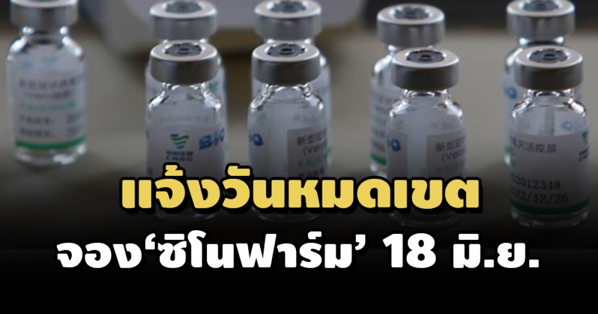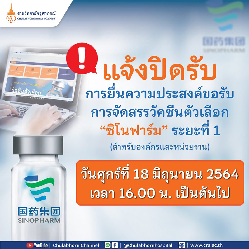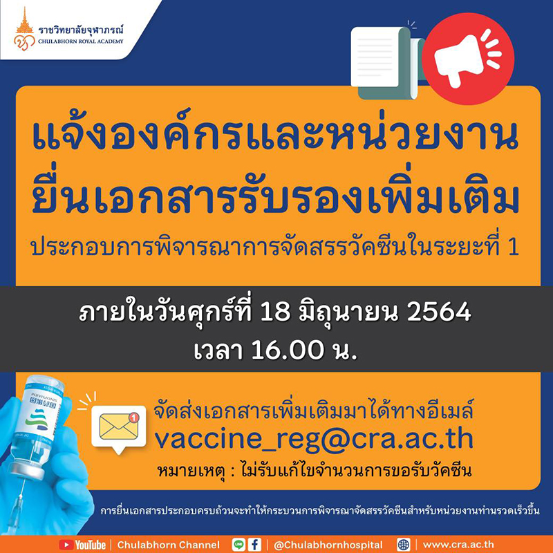 ราชวิทยาลัยจุฬาภรณ์ แจ้งวันหมดเขตลงทะเบียนจองวัคซีนซิโนฟาร์ม พร้อมเปิดให้องค์กรและหน่วยงานยื่นเอกสารรับรองเพิ่มเติม ประกอบการพิจารณาการจัดสรรวัคซีนชุดแรก ภายใน 18 มิ.ย.2564 เวลา 16.00น.