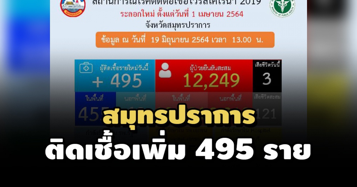 ผู้สื่อข่าวรายงานว่า เมื่อวันที่ 19 มิ.ย.2564 สำนักงานสาธารณสุขจังหวัดสมุทรปราการ รายงานสถานการณ์การระบาดประจำวัน ข้อมูลเมื่อเวลา 13.00 น. พบผู้ป่วยรายใหม่ จำนวน 495 ราย ปัจจุบันมีผู้ติดเชื้อสะสม 12,249 ราย