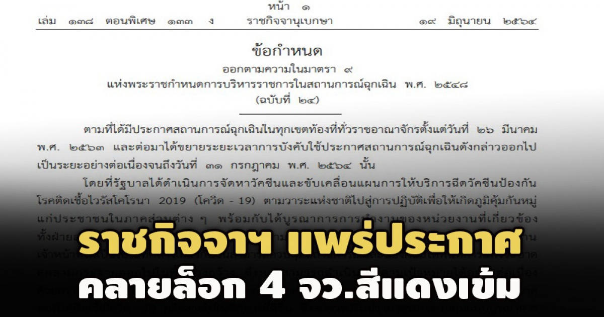 สำนักข่าวอิศรา (www.isranews.org) รายงานว่า เมื่อวันที่ 19 มิ.ย.2564 ราชกิจจานุเบกษา ได้เผยแพร่ข้อกำหนด ออกตามความในมาตรา 9 แห่ง พระราชกำหนดการบริหารราชการในสถานการณ์ฉุกเฉิน พ.ศ. 2549 (ฉบับที่ 24 ) เรื่องการพิจารณาปรับพื้นที่ตามสถานการณ์การแพร่ระบาด และพิจารณามาตรการผ่อนคลายกิจกรรม สถานที่ต่างๆ หรือมาตรการคลายล็อก การจัดแบ่งโซนพื้นที่ 4 ระดับ ตามมติศูนย์บริหารสถานการณ์การแพร่ระบาดของโรคติดเชื้อไวรัสโคโรนา 2019 (ศบค.) ป็นทางการแล้ว ให้มีผลตั้งแต่ 21 มิ.ย.2564 เป็นต้นไป