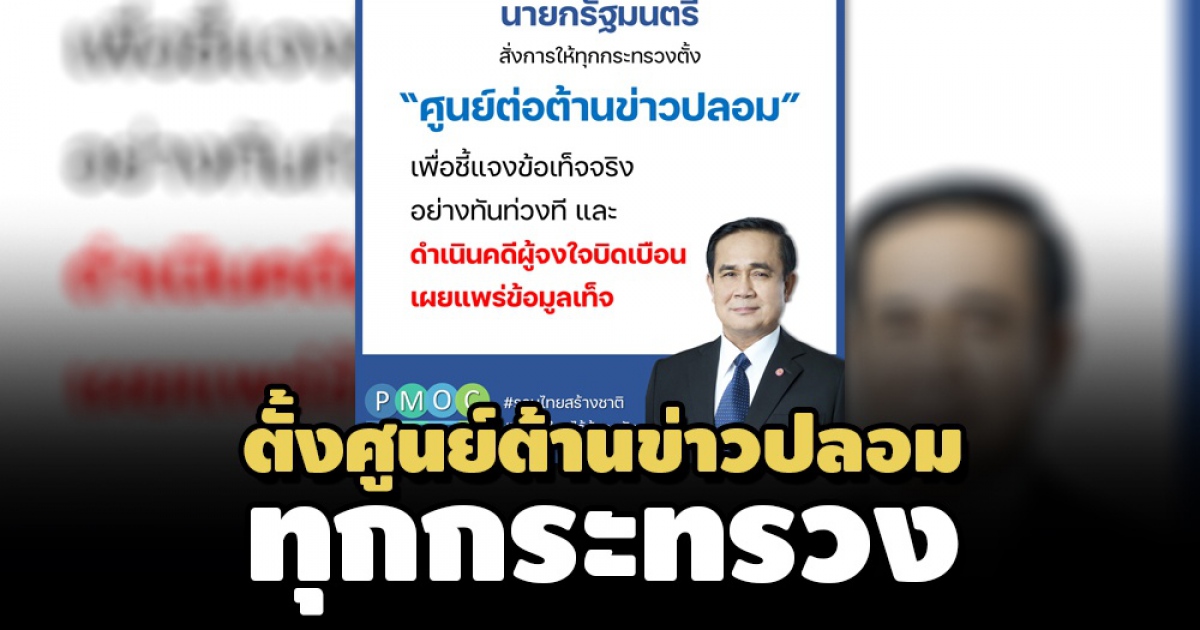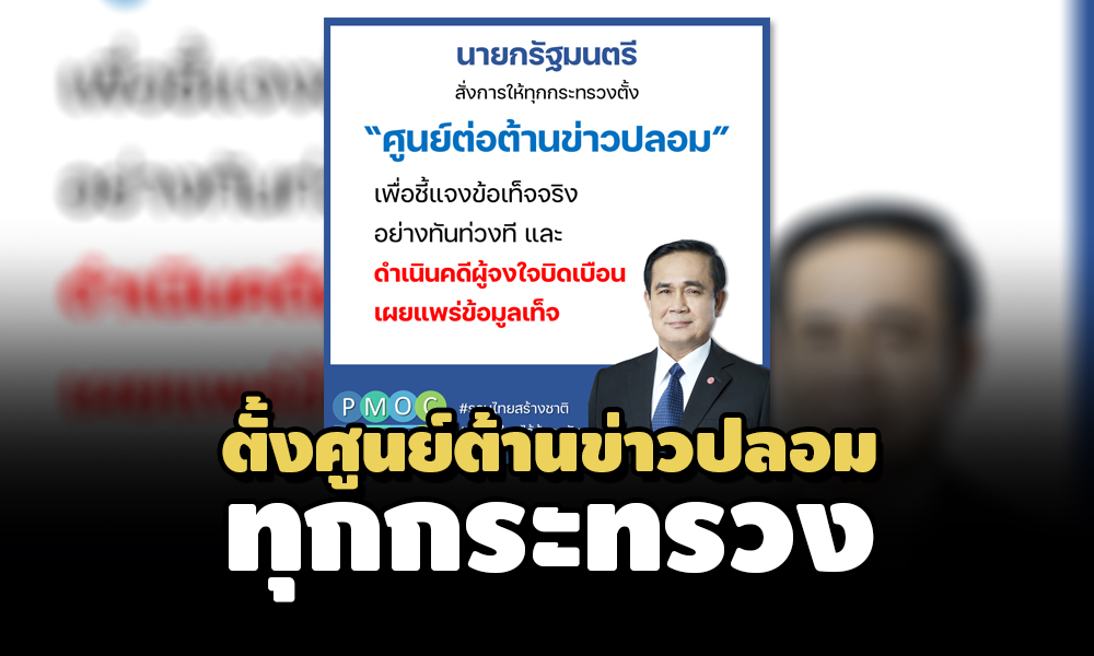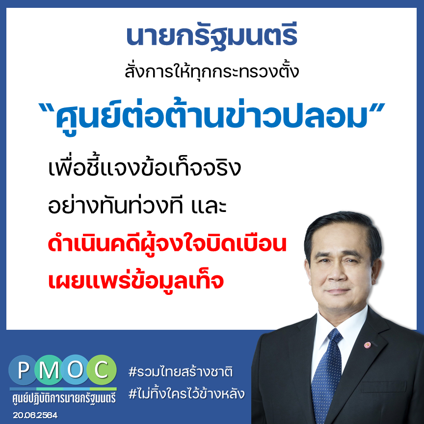เมื่อวันที่ 20 มิ.ย. 2564 ศูนย์ปฏิบัติการสำนักนายกรัฐมนตรี เผยแพร่ข้อความ ระบุว่า พล.อ.ประยุทธ์ จันทร์โอชา นายกรัฐมนตรี และ รมว.กลาโหม สั่งการทุกส่วนราชการจัดตั้งศูนย์ต่อต้านข่าวปลอม/ข่าวบิดเบือน หรือศูนย์ต่อต้าน Fake News ประจำกระทรวงเพื่อชี้แจงข่าวสารที่บิดเบือนไปจากข้อเท็จจริงให้ประชาชนได้รับทราบอย่างทันท่วงที ขณะนี้หลายกระทรวงได้จัดตั้งศูนย์ต่อต้านข่าวปลอม/ข่าวบิดเบือนประจำกระทรวงแล้ว อาทิ กระทรวงการอุดมศึกษา วิทยาศาสตร์ วิจัยและนวัตกรรม กระทรวงอุตสาหกรรม กระทรวงกลาโหม กระทรวงการท่องเที่ยวและกีฬา กระทรวงทรัพยากรธรรมชาติและสิ่งแวดล้อม เป็นต้น ขณะที่บางกระทรวง แม้ไม่มีการจัดตั้งศูนย์ต่อต้านข่าวปลอมแต่มีภารกิจงานรองรับ ทำหน้าที่ในการติดตามตรวจสอบและชี้แจง รวมทั้งทำหน้าที่ประสานศูนย์ต่อต้านข่าวปลอมแห่งชาติด้วย อาทิ กระทรวงสาธารณสุข กระทรวงการคลัง กระทรวงการต่างประเทศ กระทรวงคมนาคม กระทรวงพลังงาน กระทรวงแรงงาน กระทรวงศึกษาธิการ นอกจากนี้ กรมประชาสัมพันธ์ ยังมีการชี้แจงเกี่ยวกับข่าวปลอมเป็นประจำผ่านเว็บไซต์/เฟซบุ๊ก “ข่าวจริงประเทศไทย” อีกด้วย