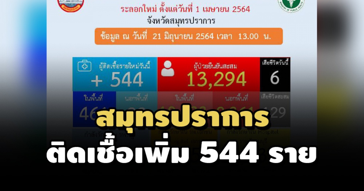 ผู้สื่อข่าวรายงานว่า เมื่อวันที่ 21 มิ.ย.2564 สำนักงานสาธารณสุขจังหวัดสมุทรปราการ รายงานสถานการณ์การระบาดประจำวัน ข้อมูลเมื่อเวลา 13.00 น. พบผู้ป่วยรายใหม่ จำนวน 544 ราย ปัจจุบันมีผู้ติดเชื้อสะสม 13,294 ราย
