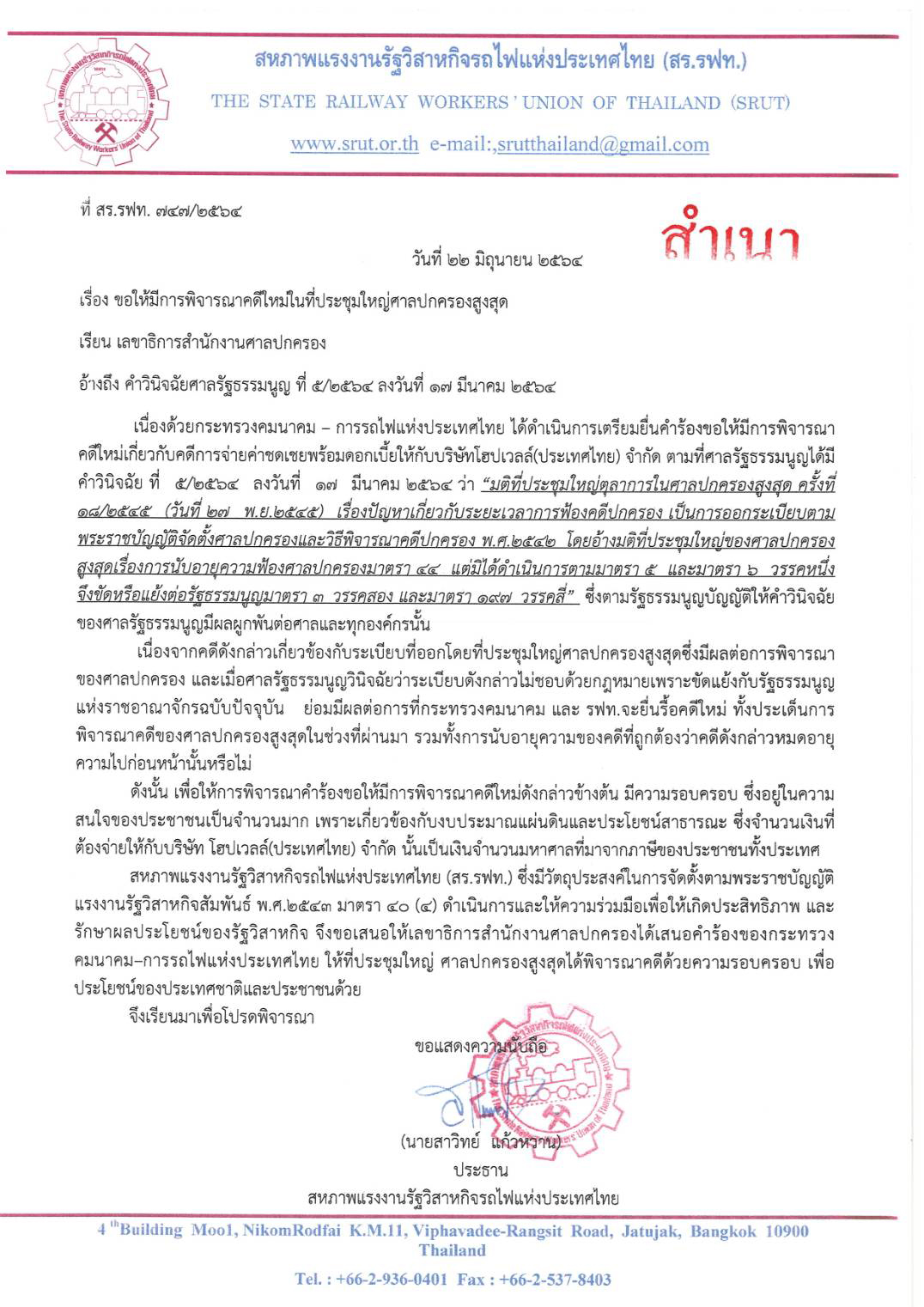สร.รฟท.ยื่นหนังสือถึง ‘เลขาฯศาลปกครอง’ ขอให้เสนอคำร้อง ‘คมนาคม-รฟท.’ ที่ยื่นขอให้รื้อ ‘คดีโฮปเวลล์’ เข้าสู่ที่ประชุมใหญ่ศาลปกครองสูงสุด